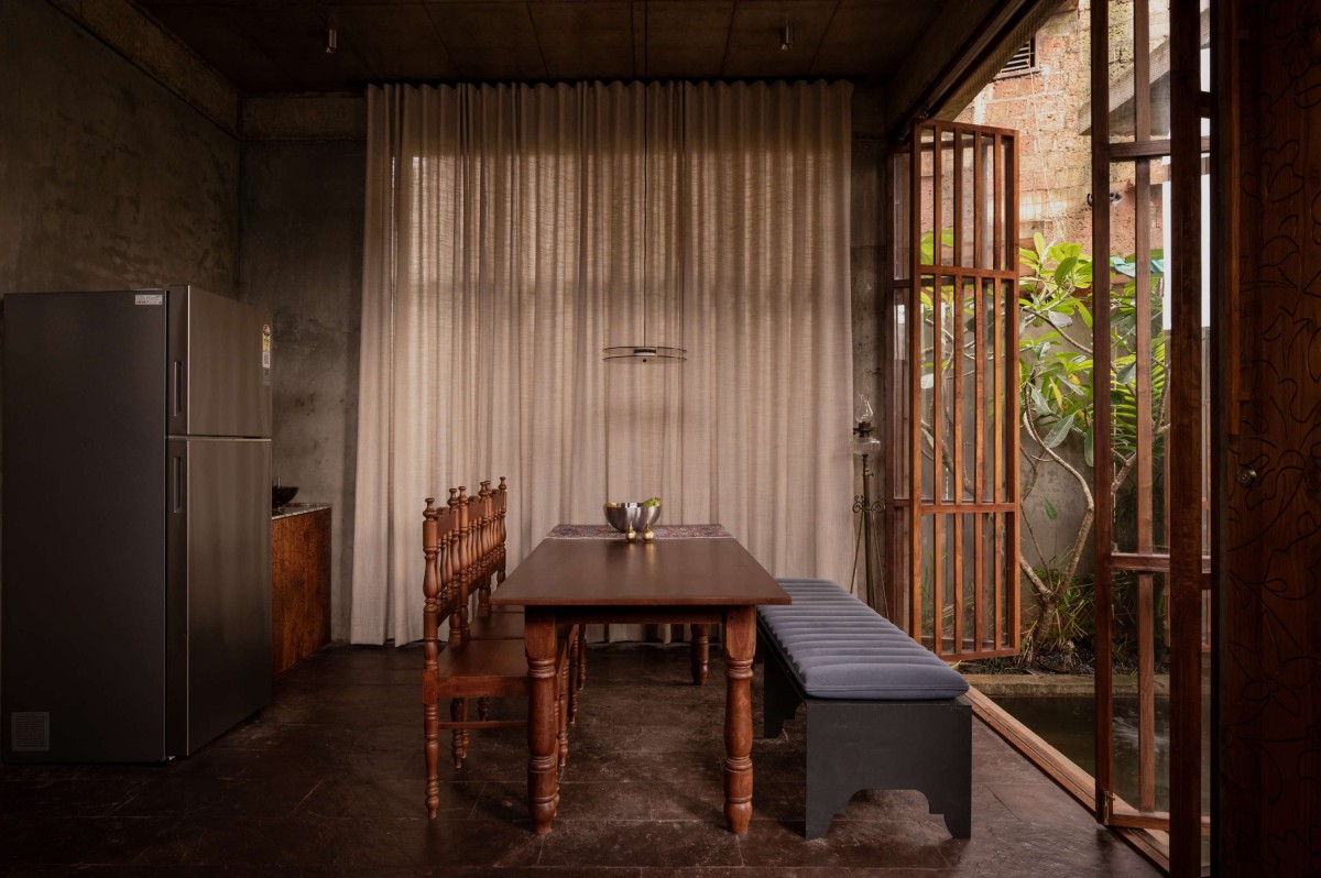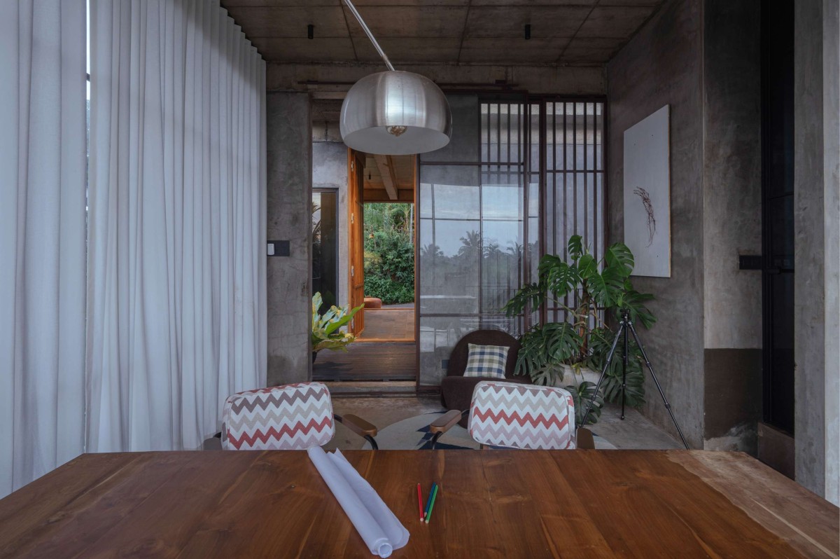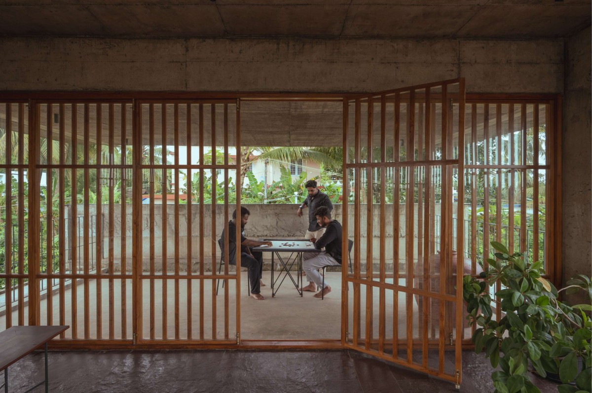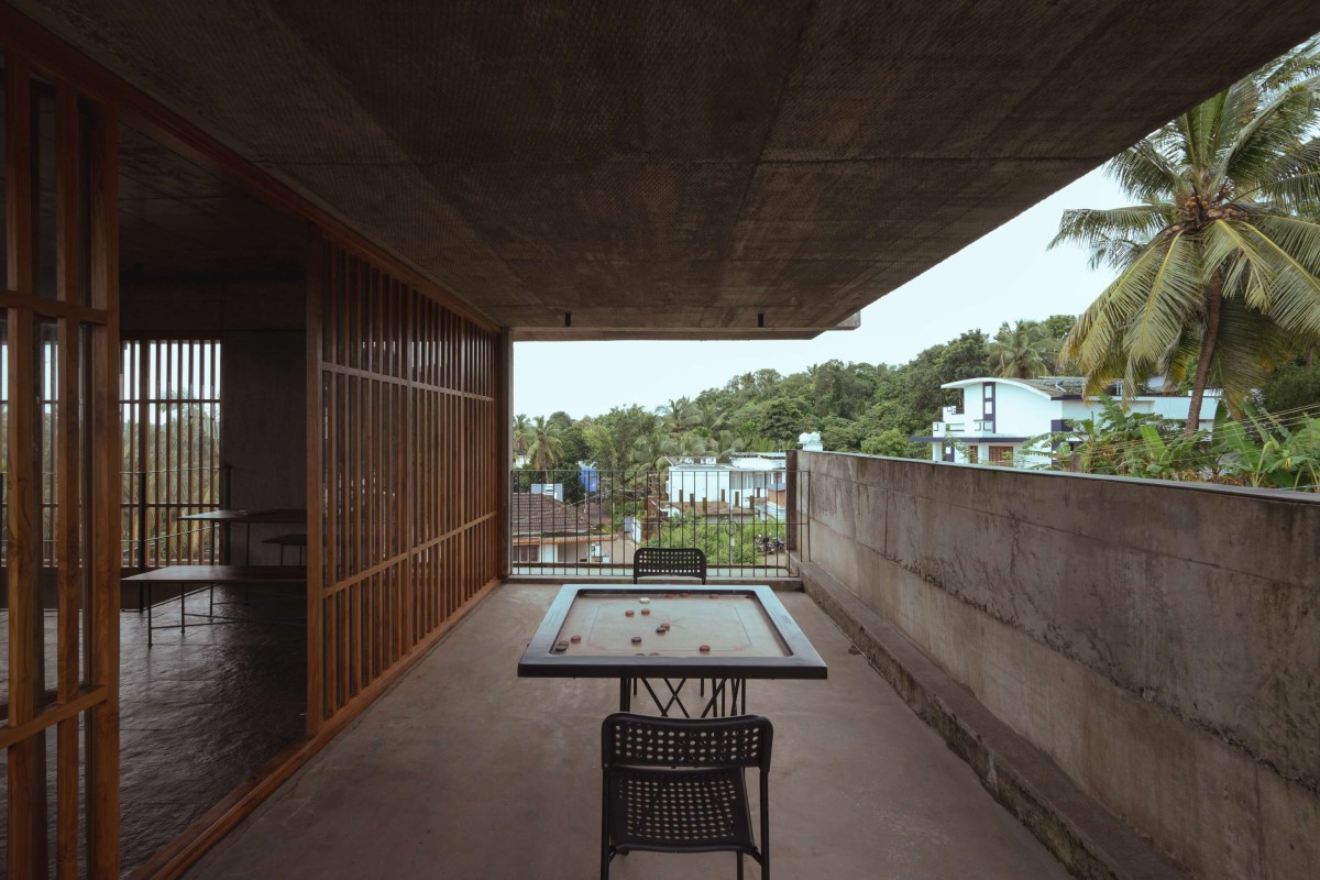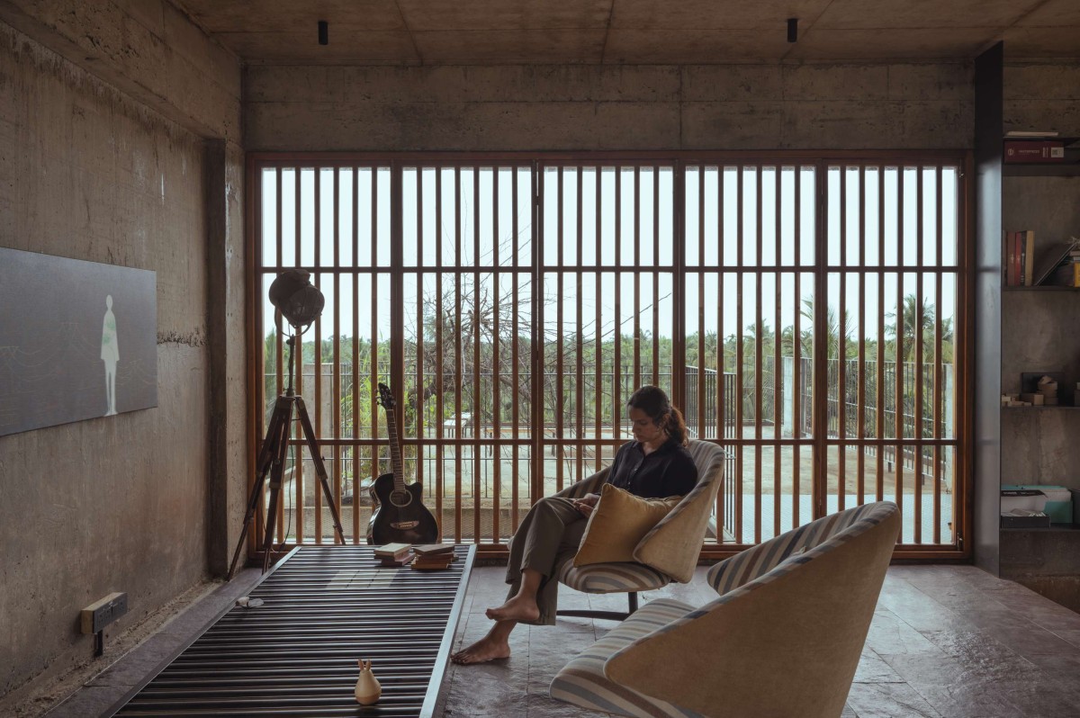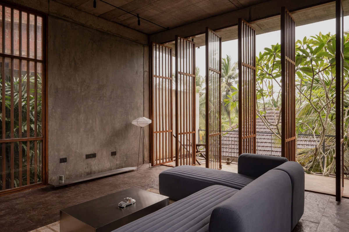The large openings accentuated with wooden detailing were incorporated using repurposed timber, sourced and integrated into the project to reflect both environmental responsibility and craftsmanship. The walls feature an exposed cement finish, creating a dynamic interplay of textures that highlight the raw beauty of the material. Ceilings bear the imprint of the shuttering used during the casting process, adding to the tactile quality of the space.