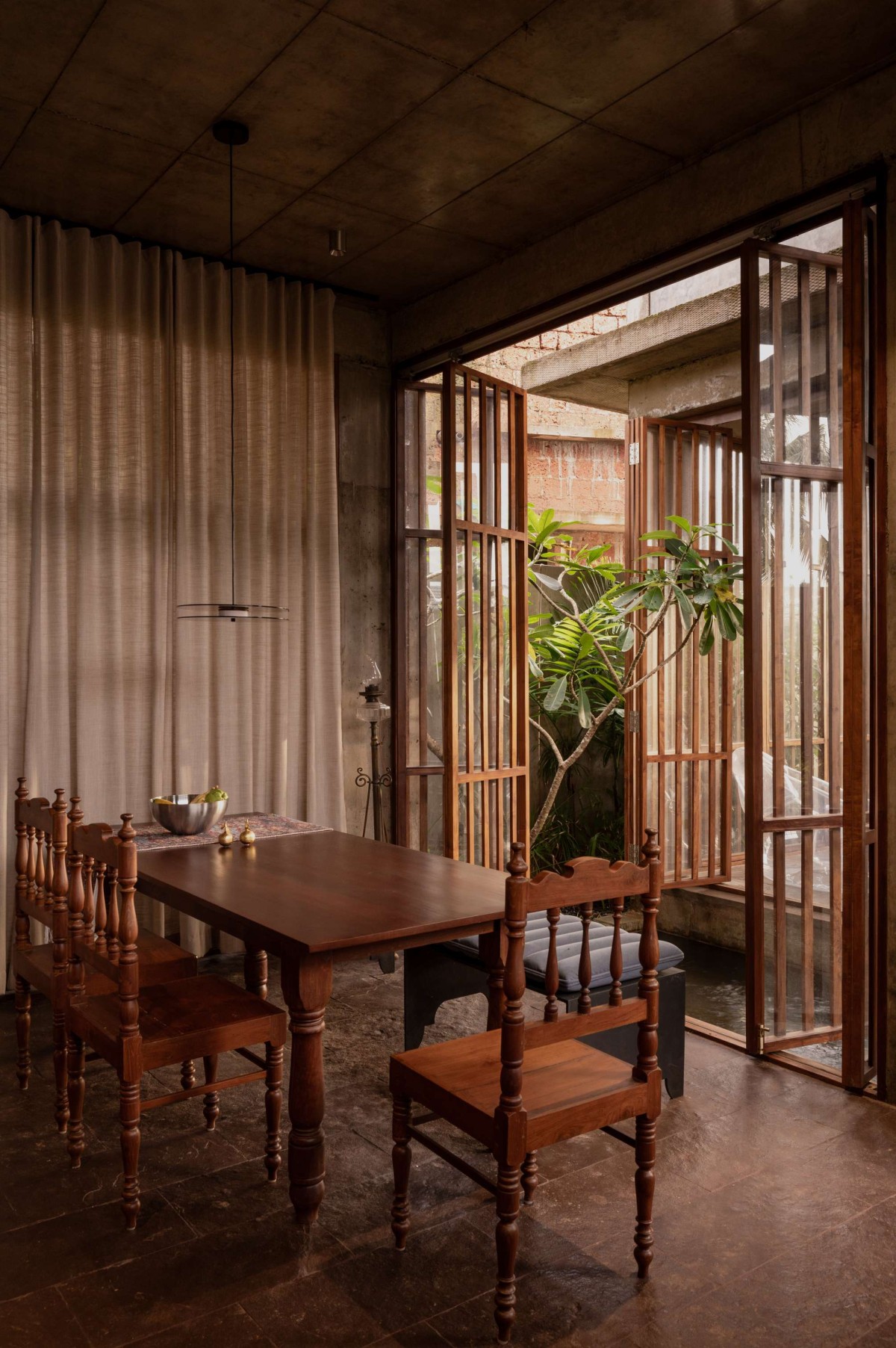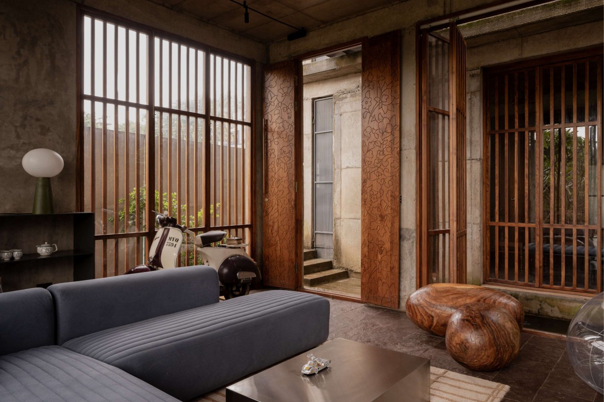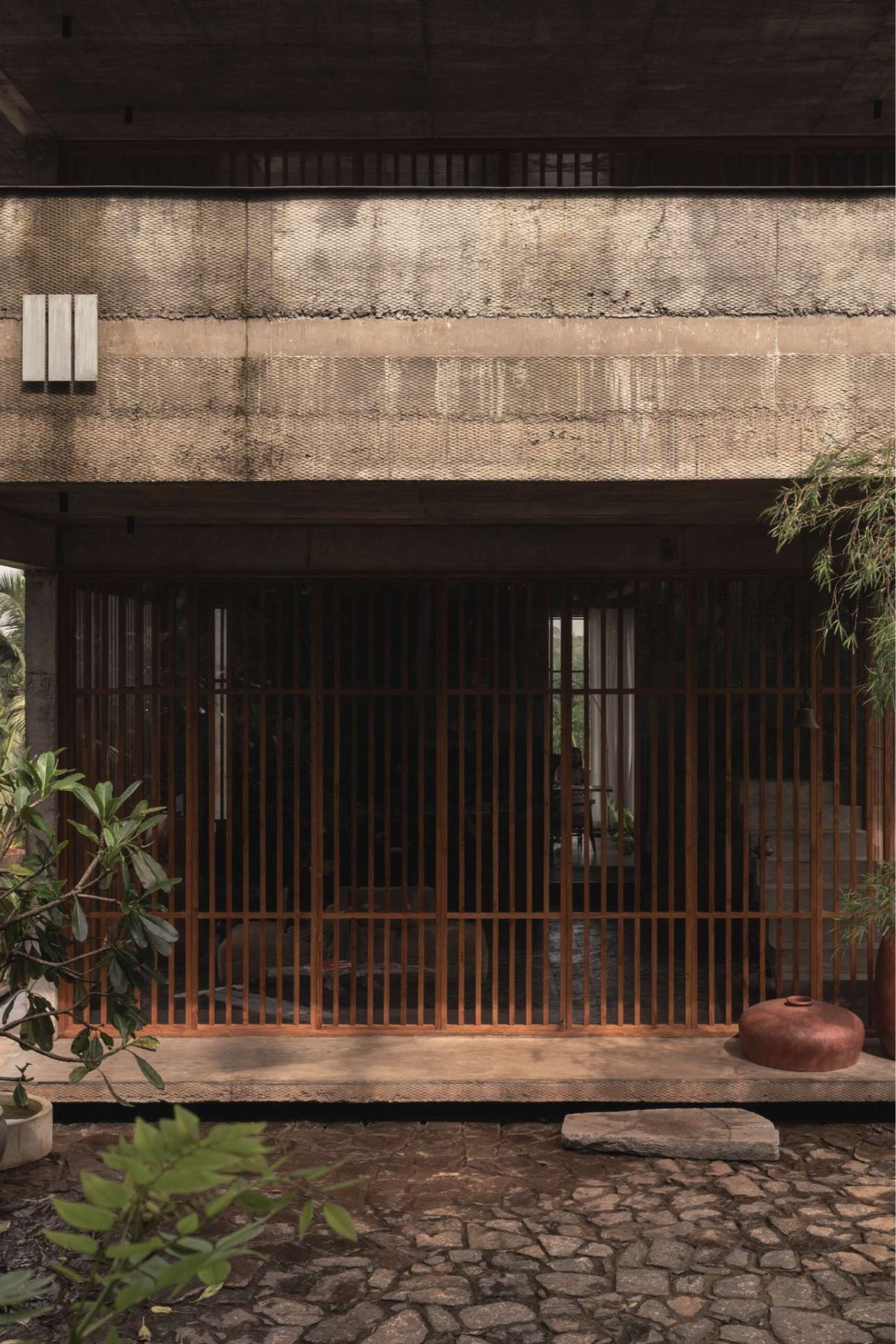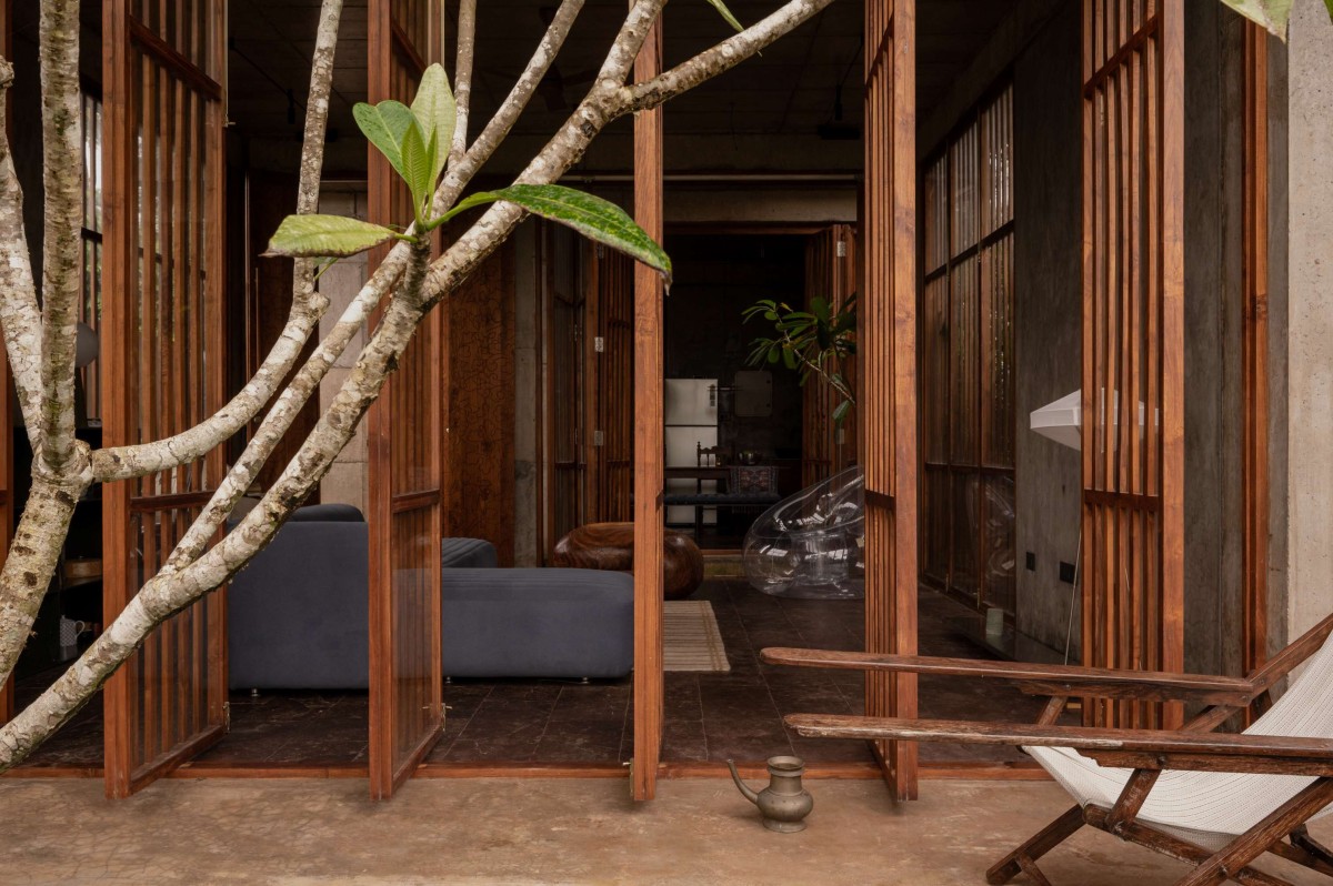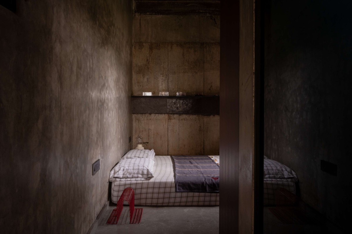 The large openings accentuated with wooden detailing were incorporated using repurposed timber, sourced and integrated into the project to reflect both environmental responsibility and craftsmanship. The walls feature an exposed cement finish, creating a dynamic interplay of textures that highlight the raw beauty of the material. Ceilings bear the imprint of the shuttering used during the casting process, adding to the tactile quality of the space.