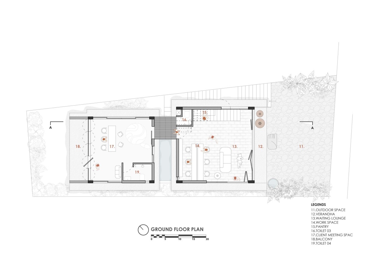 At the office space level, i.e;  at the ground floor the entrance has a transitional space, the verandah that is thoughtfully crafted so as to have an intermediate space that segregates the exterior and interior of the office. As we approach further inside the office, the  transparency and openness of the working space is visible, rather than restricting them to mere cubicles. A segregated space for the meetings has been zoned above the living area. The open office space and the meeting space is separated by a transitional open space which overlooks the waterbody. The meeting space has a balcony attached to it that enhances openness and emphasizes the natural view.