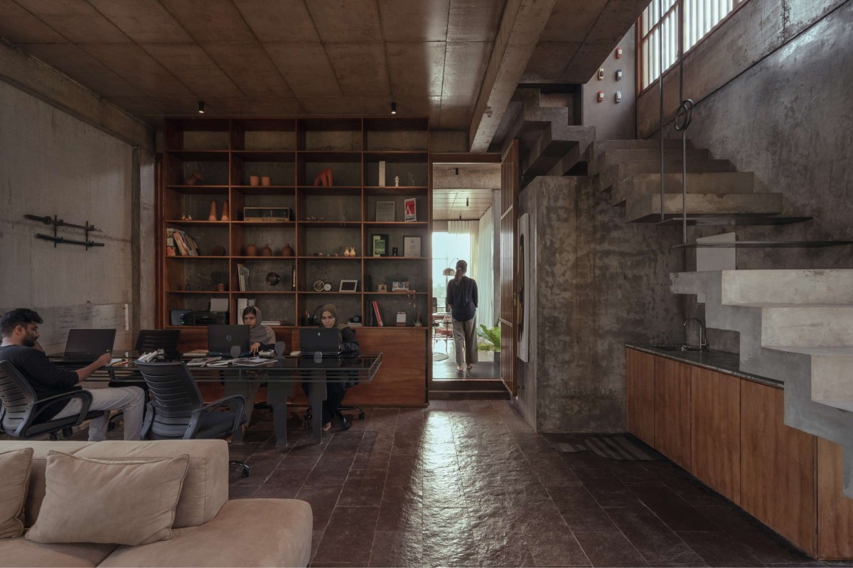 The flooring combines rough-textured Kota stone with areas of cement-finished surfaces, contributing to a grounded and honest material palette. Exposed metal elements are used for railings and stair treads, acting as transitional components between different office spaces and levels, while reinforcing the industrial aesthetic. Together, these raw and exposed materials reveal the architectural character of the space—raw, resilient, and authentic.
