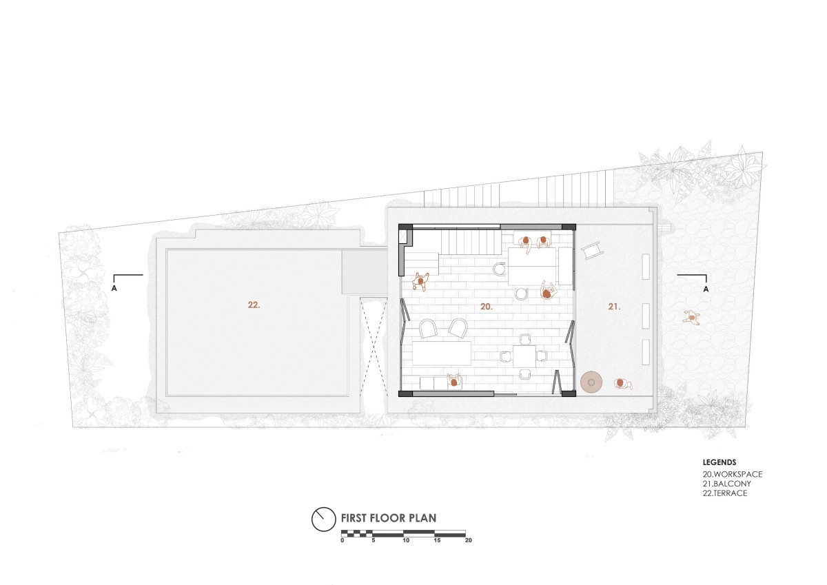 At the first floor level,  the space is typically defined to have a dynamic character. The space is designed to be flexible and adaptive, evolving to accommodate a variety of functions as needed. It can seamlessly transform into a collaborative zone for internal staff meetings, informal discussions, or in-house presentations. Its open design, in connection with the adjacent balcony, allows the area to expand outward, making it ideal for hosting model-making workshops and other creative sessions.