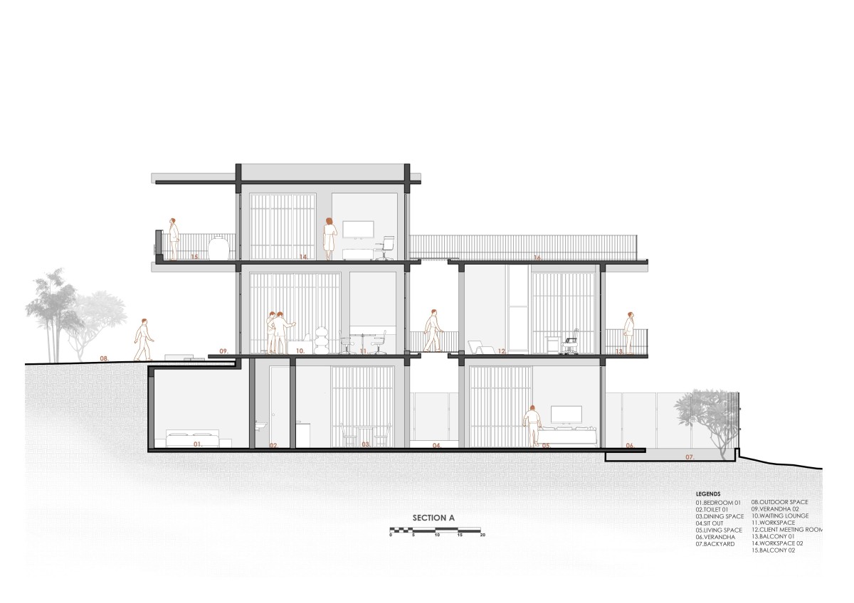 The building is strategically integrated as a linear mass block along the natural slope without disturbing the natural topography of the site. The proposed linear site had residential neighborhoods on all three sides and hence a void was added to the linear mass in order to avoid clustering in the linear block. This void space also acts as a visual connection between the two floors fostering connectivity between the two floors. Furthermore, the  residential space does not feel left behind below the office space nor have darker spaces inside the rooms.