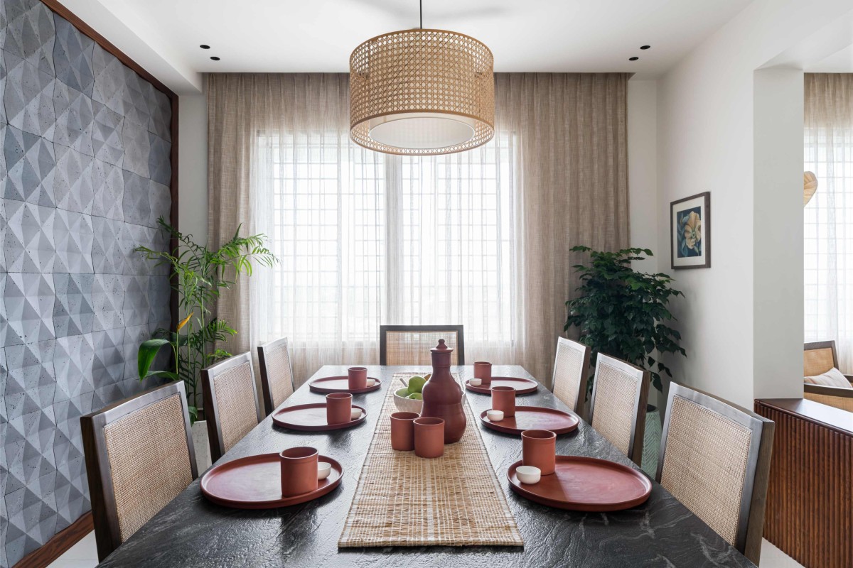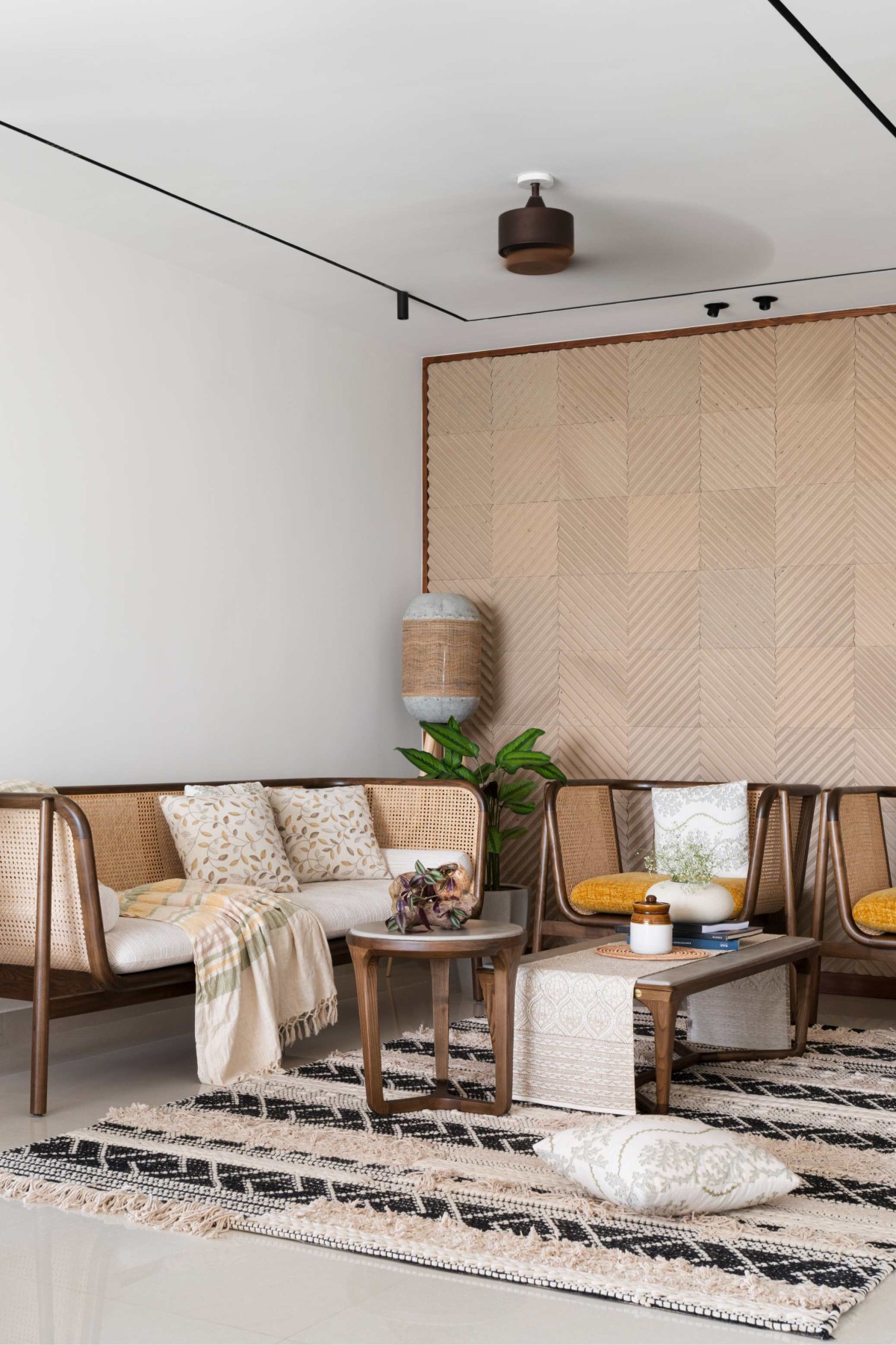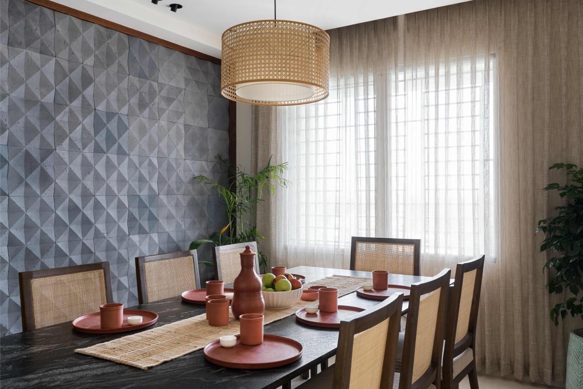 The formal living room adopts a contemporary language shaped by texture and restraint. Cement-finish surfaces, subtle wall cladding, curated artworks, and statement lighting create a refined setting where luxury is expressed quietly. Soft fabrics and selective colour accents add comfort and visual depth.