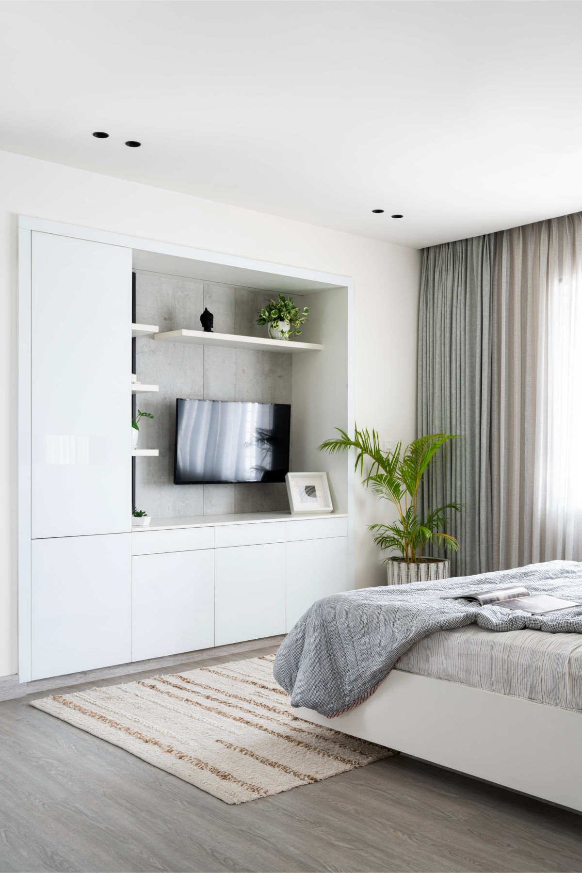 In contrast to the common areas, the bedrooms follow a more minimal and contemporary approach. Here, luxury is communicated through proportion, material quality, and function rather than ornament. Sliding wardrobes, integrated storage, mirrors, and carefully placed lighting enhance usability while maintaining visual calm.