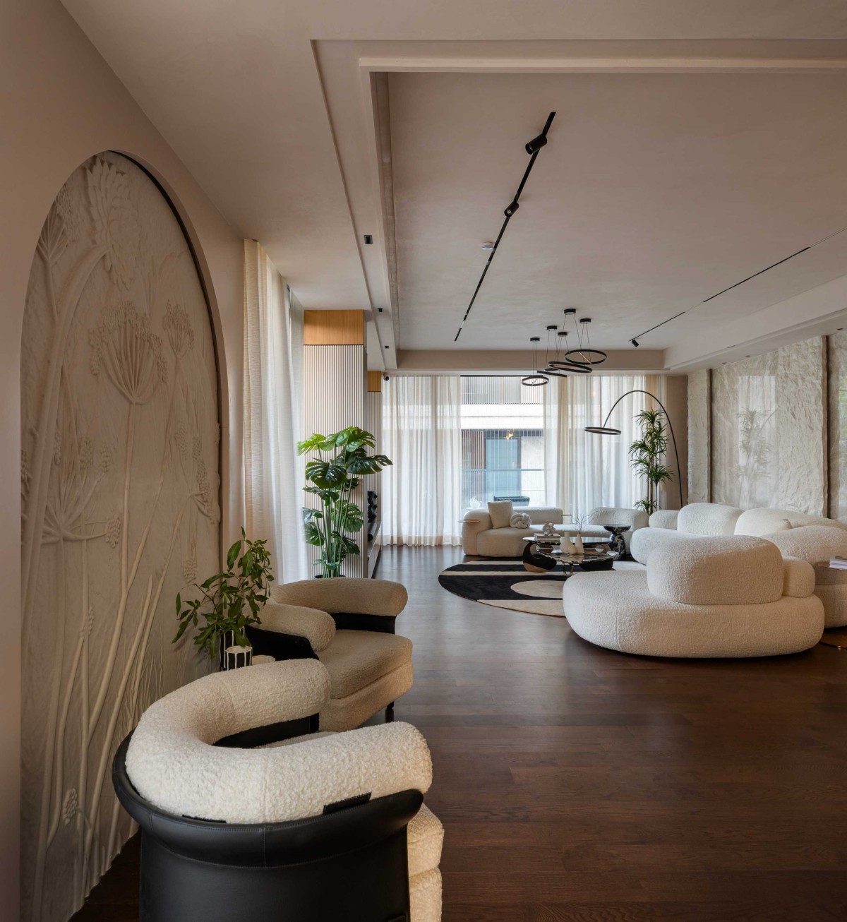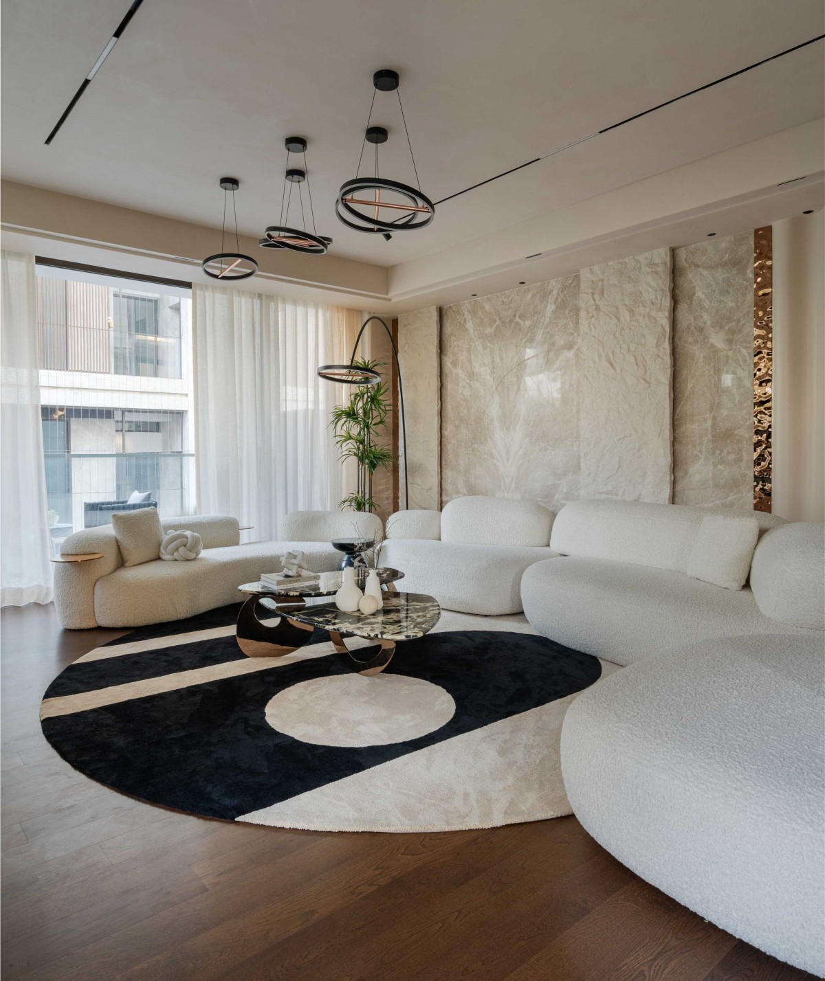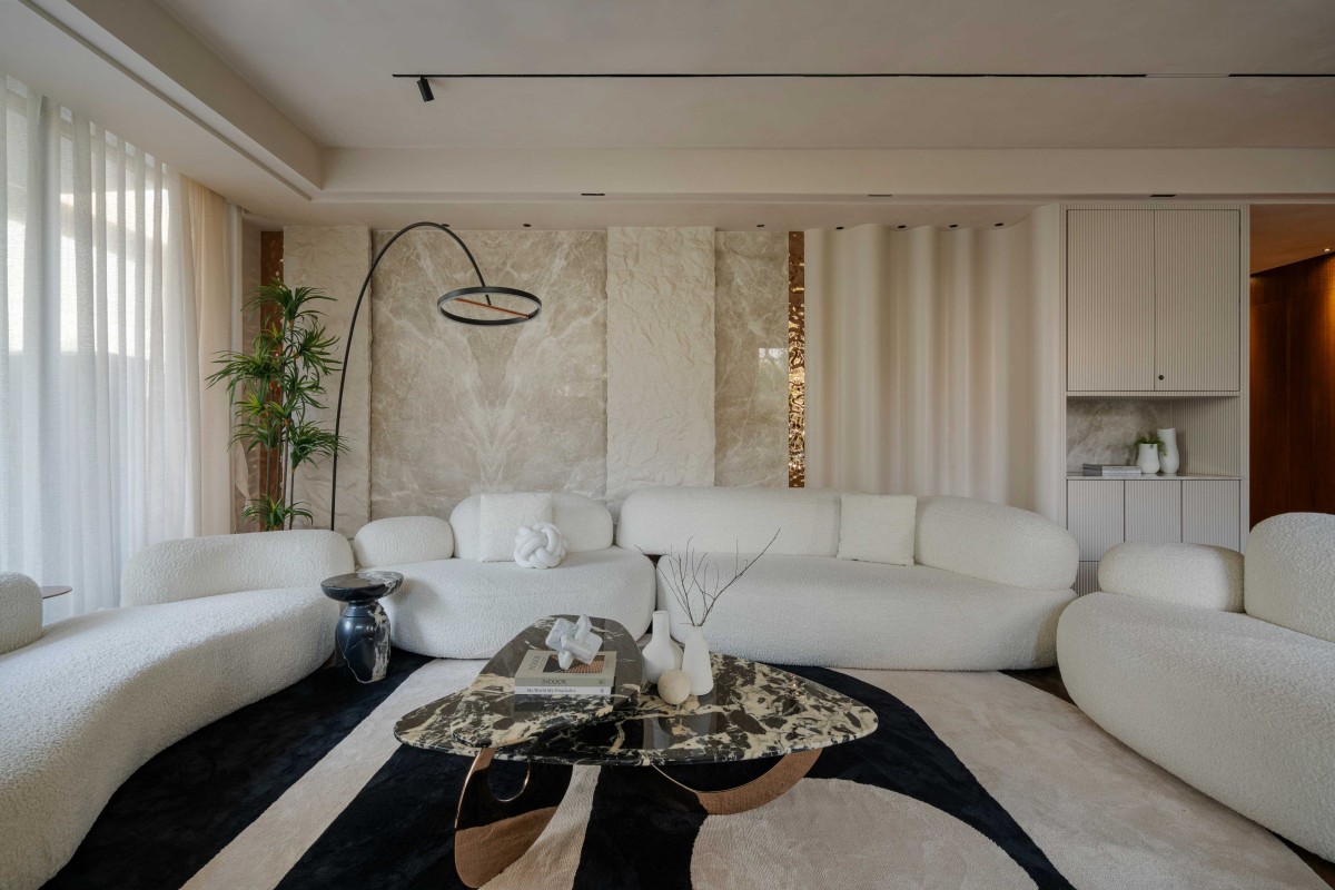 The serene and sculptural living room, the essence of organic modernism unfolds through a harmonious blend of texture, tone, and form. Anchored by voluptuous, cloud-like bouclé sofas arranged in a conversational arc, the space evokes softness and balance. At the center, a striking black panda marble coffee table introduces a tactile interplay of smooth stone against plush textile, while its asymmetrical silhouette mirrors the room’s natural fluidity. It pairs effortlessly with the vertical stone panels and ribbed cabinetry, continuing the theme of refined naturalism. The walls serve as a quietly powerful backdrop, treated in a subtle lime wash finish that enhances the organic feel of the room. The hand-applied texture creates gentle tonal variations that shift with the light, adding depth and movement without overpowering the minimalist palette.