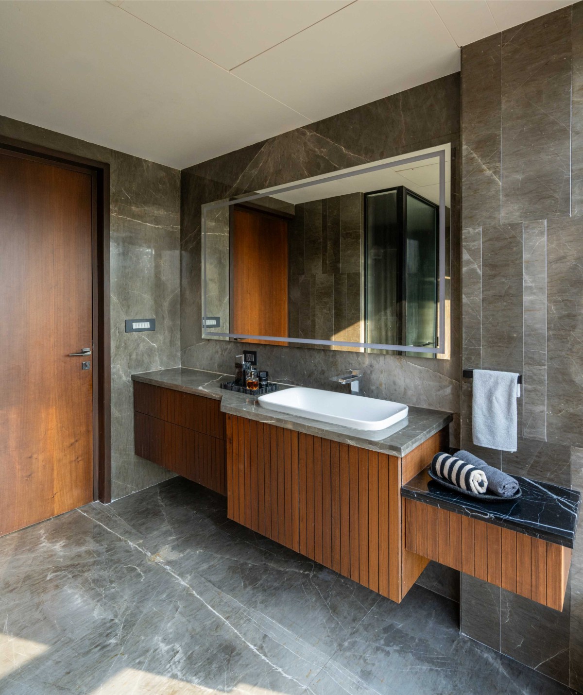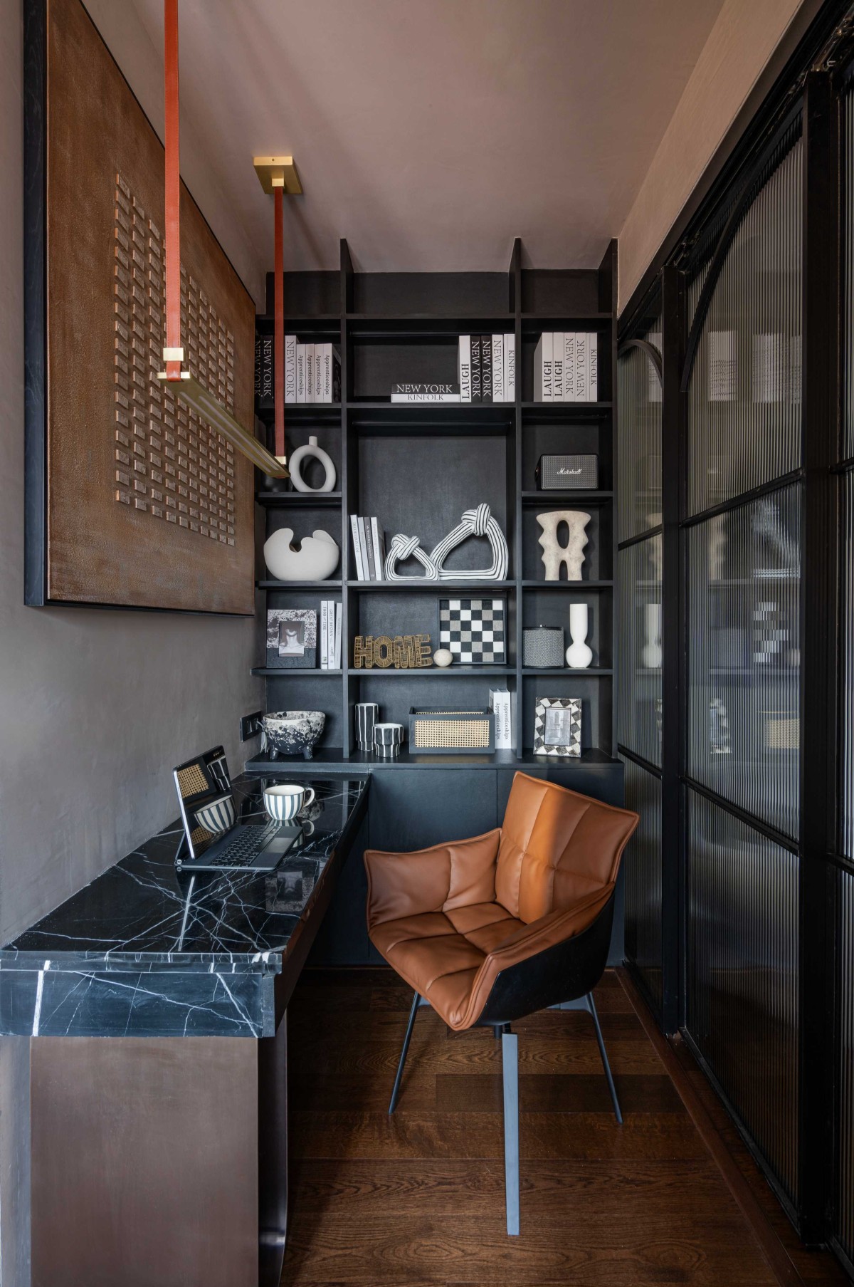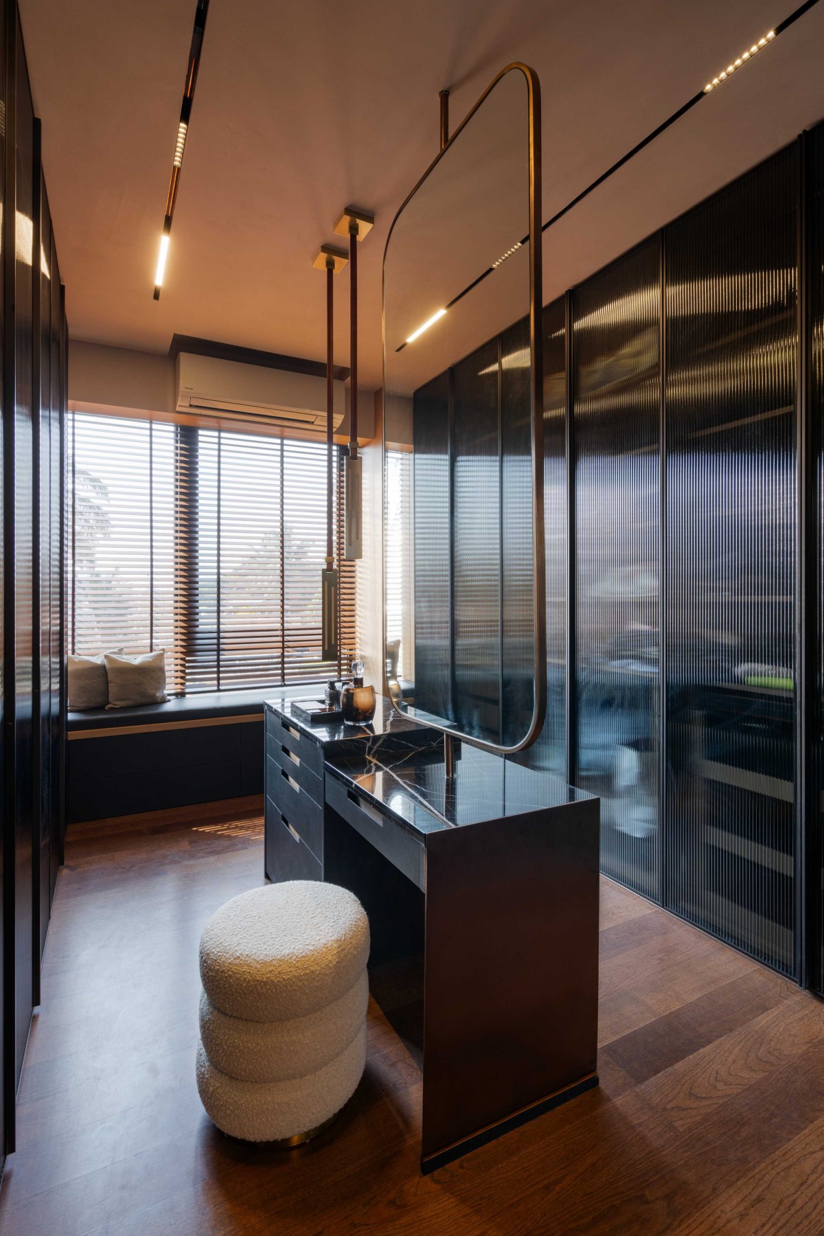 The bedroom adjacent to the master was transformed into a bespoke walk-in closet and study, seamlessly connected to the master suite. While black is often unconventional in Indian homes, it takes center stage here. The striking black marble bed backdrop is paired with leather-finished curved panelling and a lime-wash texture that extends onto the ceiling. The TV wall features custom stucco stone skin panelling, fluted wood-finish drawers, and a marble-fronted design, creating a seamless blend of textures. A cozy reading nook bridges the master suite and the walk-in closet, with ecru duco-finished fluted panelling and a leather-wrapped decorative light fixture. Further enriching the space, we introduced fluted glass dividers, black leather shelving in the study, and an opulent rose gold and black island in the walk-in closet—exuding understated quiet luxury.