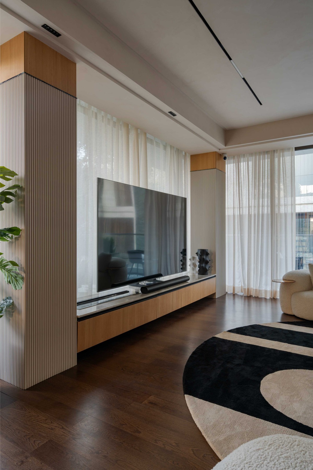 By day, the living area glows with earthy hues and tactile finishes, creating a grounded, serene atmosphere. By night, it shifts into a vibrant social hub, complete with a hidden bar unit and surround sound system that elevate the mood for entertaining. At its core is a striking 10-foot floating TV unit, anchoring the space with a 98-inch screen and sleek electric fireplace, all bathed in natural light that blurs the boundary between indoor comfort and outdoor calm.