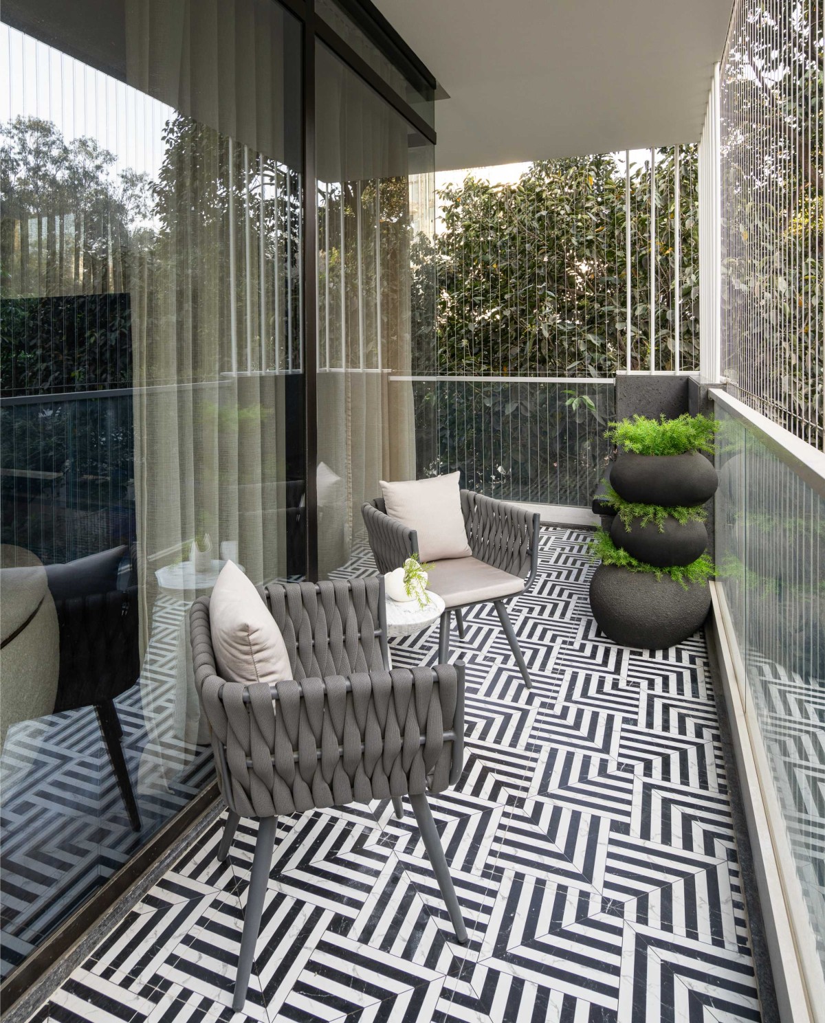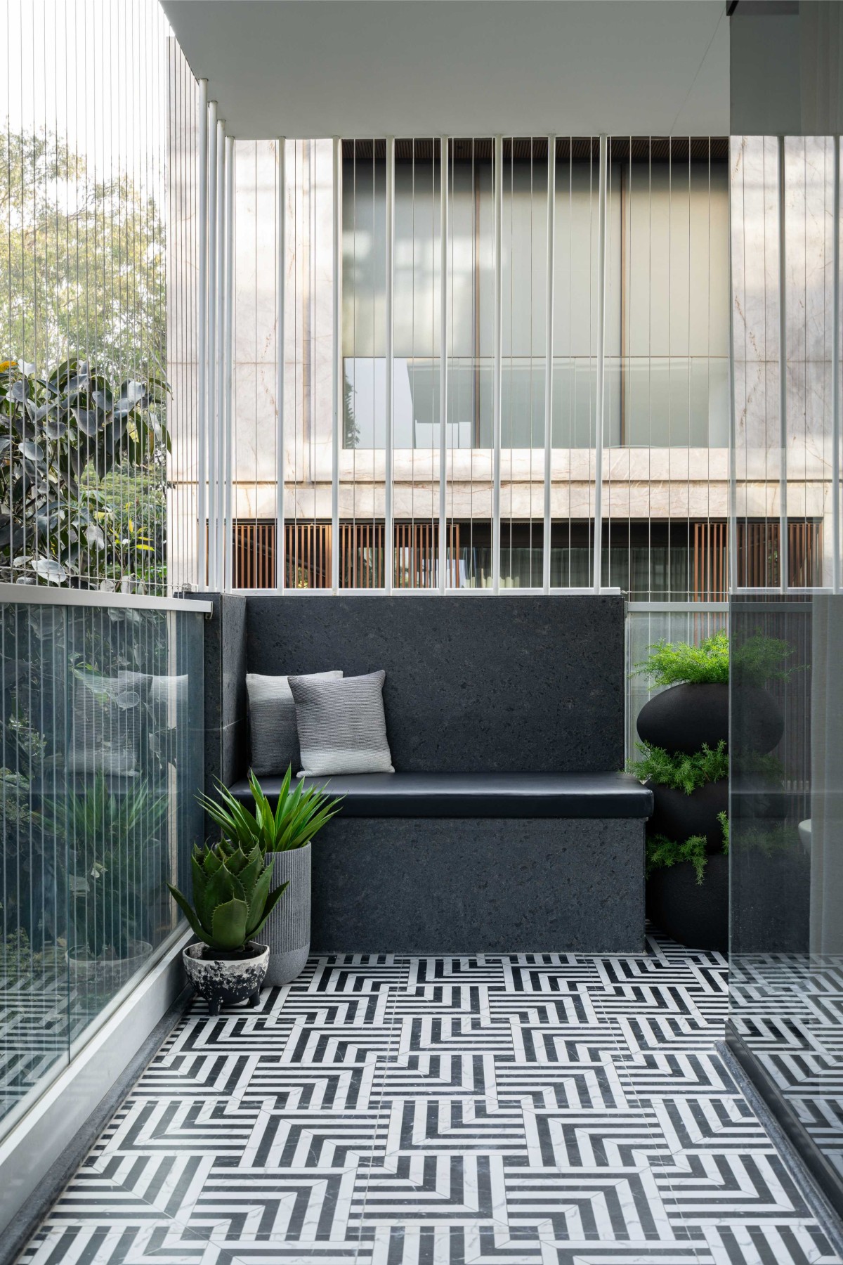 An outdoor escape with inlay black & white tiles and stone seating of Abode by Oris Architects