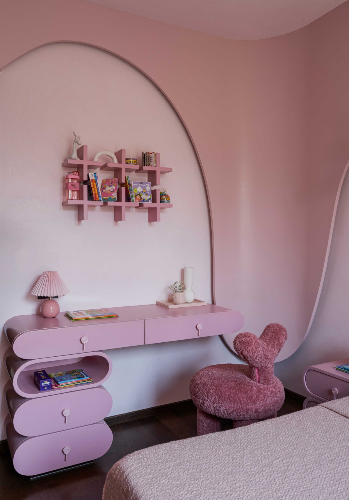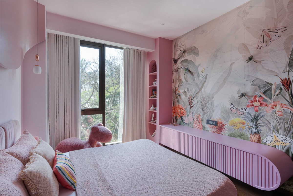 Their three-year-old daughter, Kiyara, had her own creative aspirations—she envisioned a pink room with whimsical dragonflies. Her dream materialized in a soft, curved space with a forest-themed mural wallpaper by House of Kaji, where lifelike dragonflies seemingly flutter from the walls.
