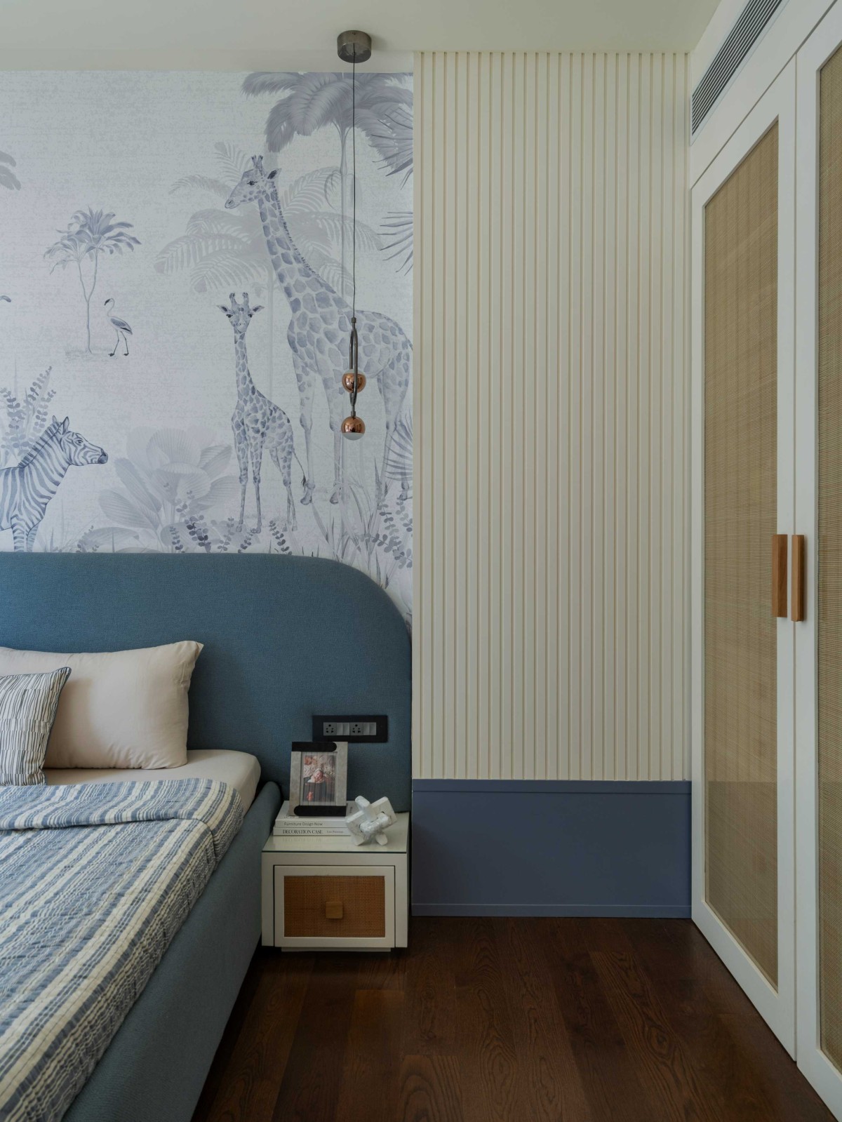 During the design process, Tanvi and Harsh discovered they were expecting twins, necessitating a shift in plans. The guest room was reimagined as a nursery inspired from Dior Nammos, Dubai featuring a blue zoo-themed wallpaper by Dolce Bambino and cane sandwiched in glass wardrobes to complete the narrative.