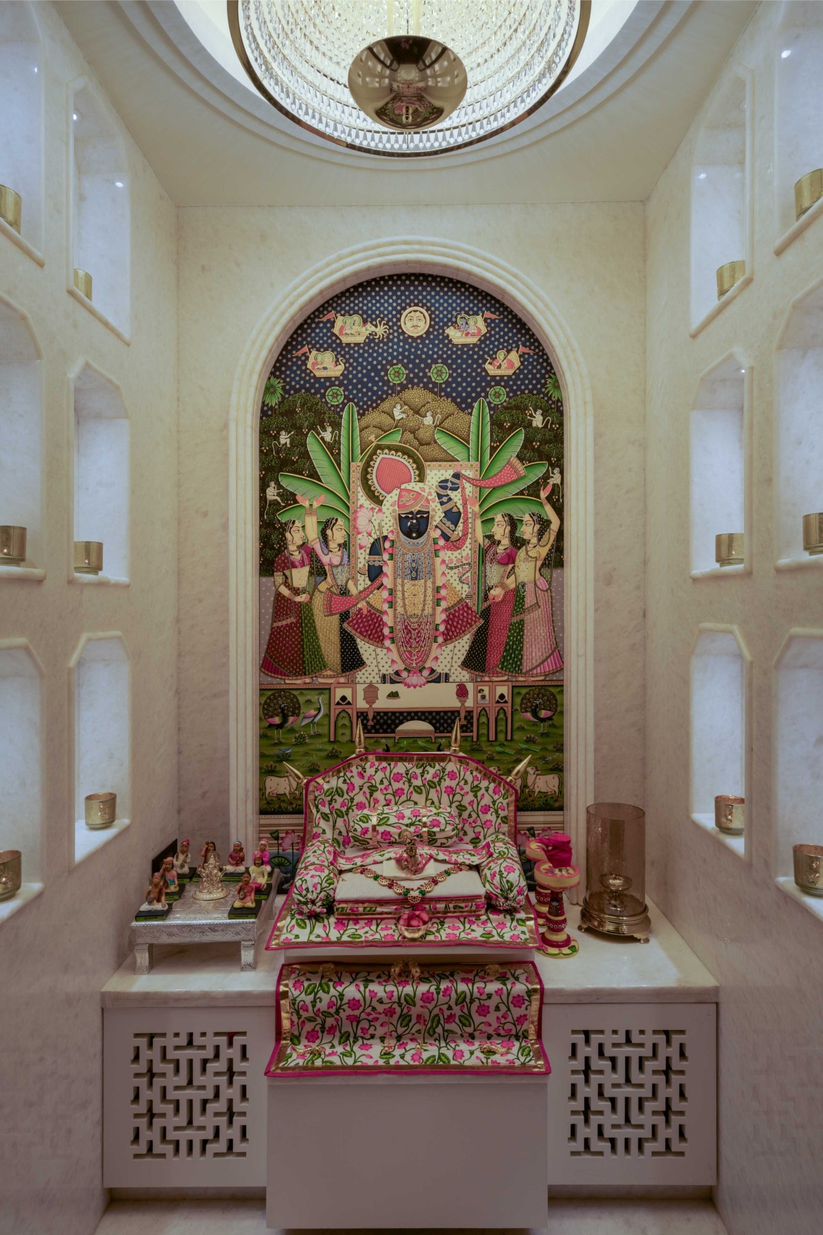 A custom pichvavi adorned on the feature wall of this temple of Abode by Oris Architects