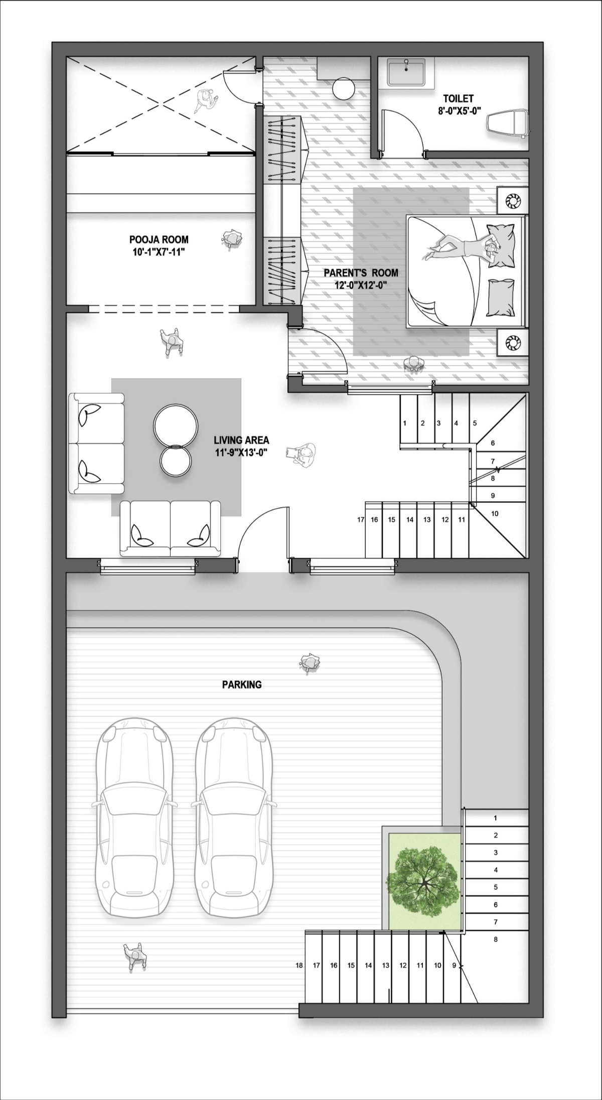 The residence is designed with a thoughtful spatial flow that begins at the main gate, leading into an open parking area. Adjacent to this, a staircase provides direct access to the first floor, while the ground floor includes a welcoming sit-out space, an open mandir that invites calm, and a well-placed parents' bedroom for easy accessibility and privacy.