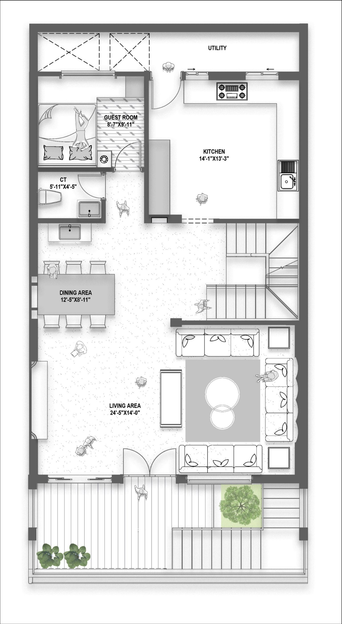 The project is structured as a G+2 residence elevated above an open parking area, with two strategically placed staircases defining circulation. The primary staircase, positioned at the front, serves as a formal entry from the first floor, establishing a sense of arrival. The secondary internal staircase connects all floors seamlessly from within, ensuring smooth vertical movement for the residents. The façade features a composition of clean lines and layered mouldings, brought to life using varied concrete finishes that add subtle texture and dept. Balconies at staggered levels introduce visual movement while maximizing openness, light, and connection to the exterior environment. The overall civil intervention reflects a balance between structural efficiency and refined architectural detailing.