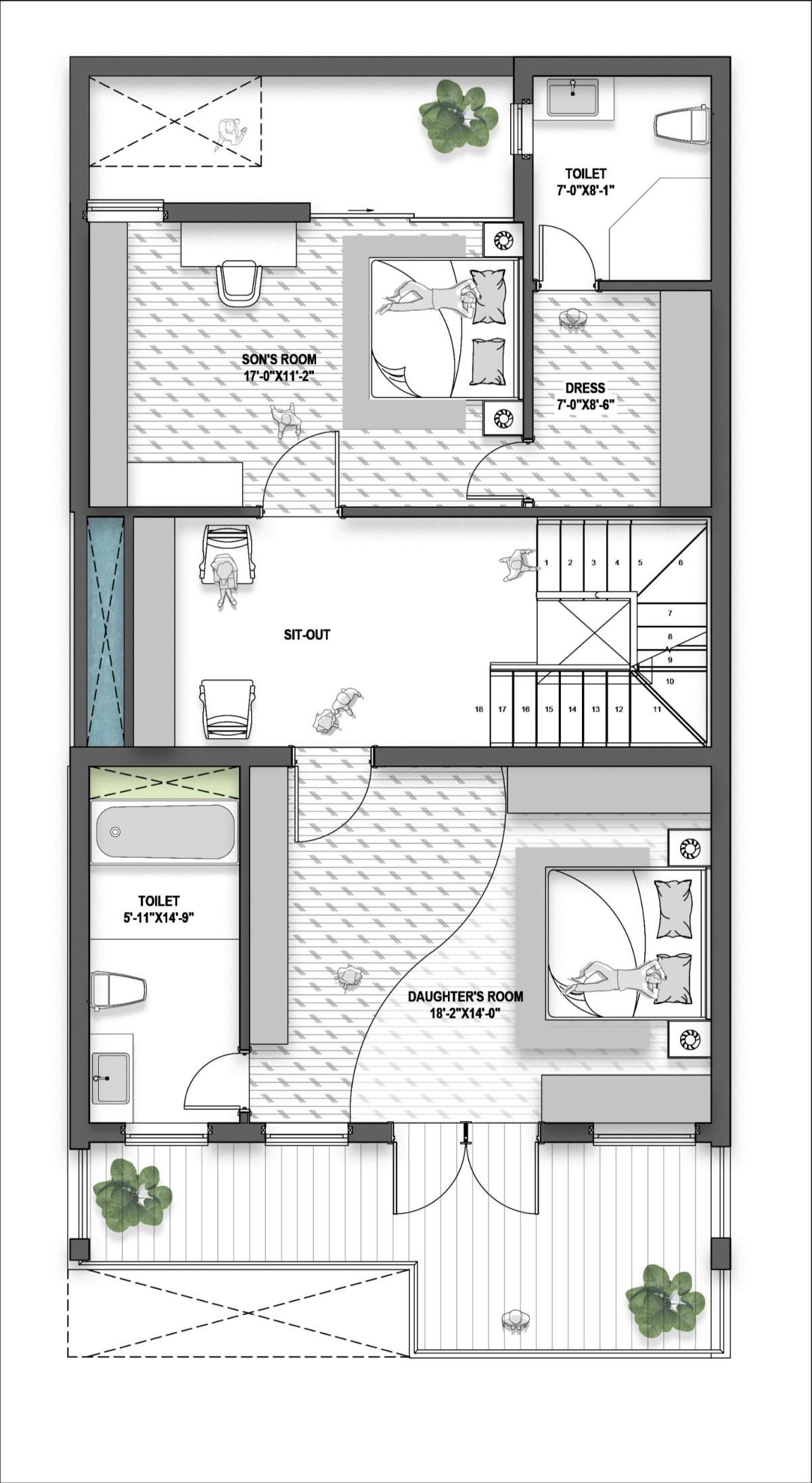 The second floor houses two master bedrooms, each with access to private balconies. A central skylit sit-out with a tranquil water fountain becomes the heart of the upper floor—an inviting pause point that blends architecture with openness, welcoming natural light and air deep into the home. This arrangement ensures a sense of continuity, comfort, and calm throughout the vertical journey of the house.