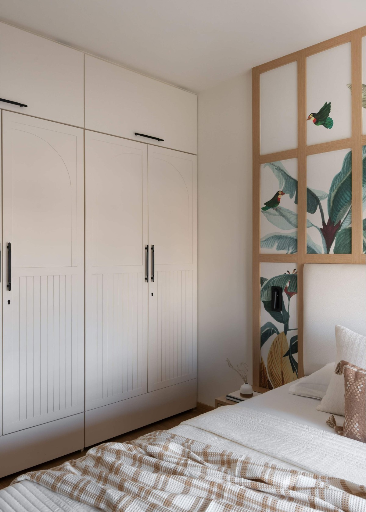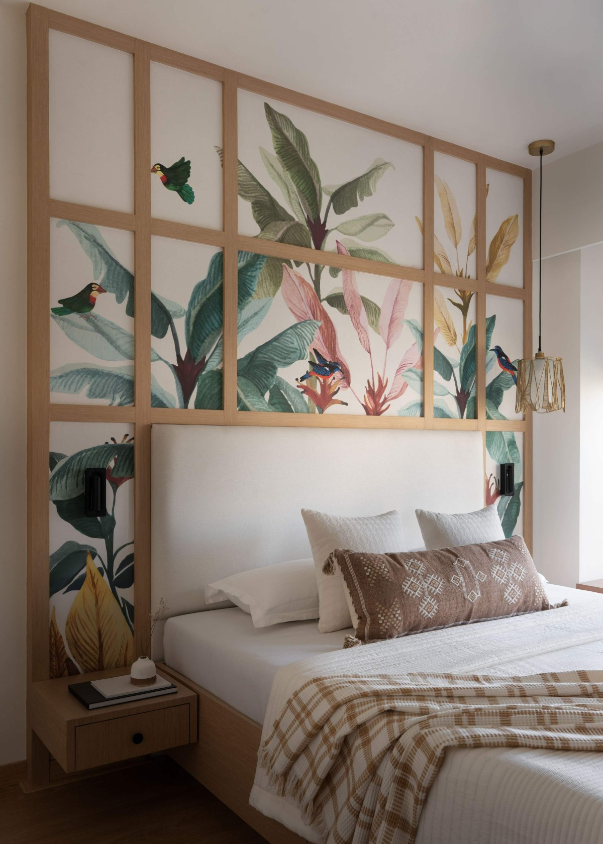The second bedroom contrasts this stillness with joyful energy. A custom botanical mural framed within a wooden grid becomes the vibrant heart of the space, echoing the emotional narrative of beginnings, growth, and color. The artwork becomes more than decoration; it is a visual expression of optimism.