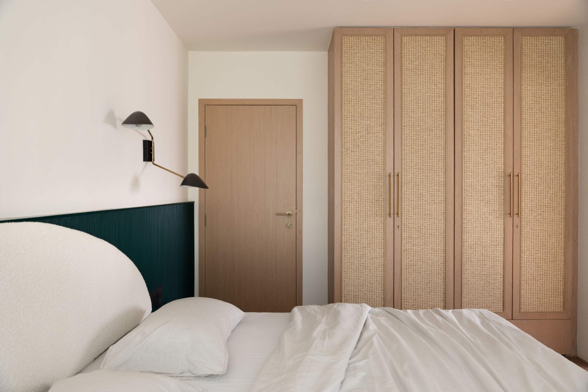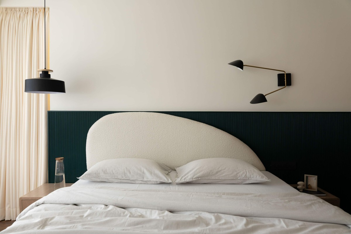 The bedrooms serve as two different emotional experiences. The master bedroom is serene and refined, where a sculptural off-white headboard sits against a deep green fluted panel, a combination that is grounding yet luxurious in restraint. The room exudes quiet confidence, allowing the couple to retreat, reflect, and reset.