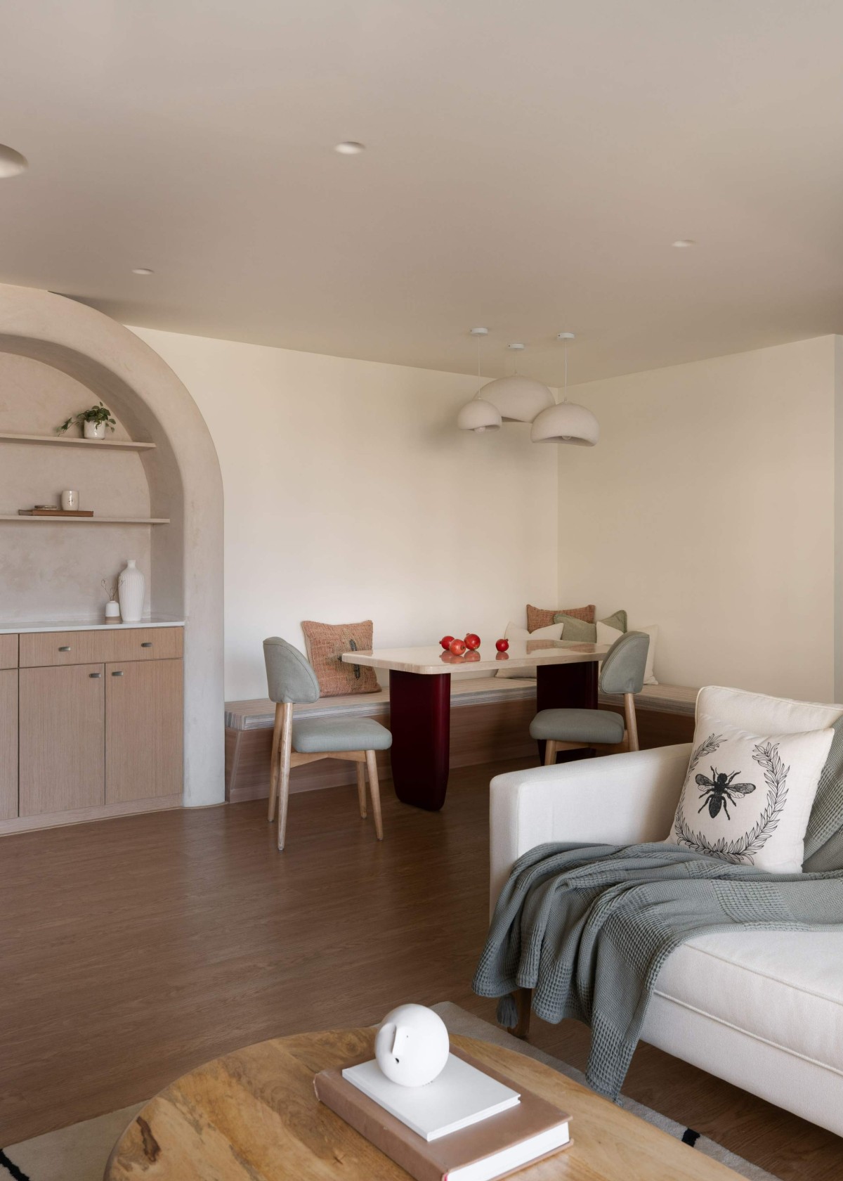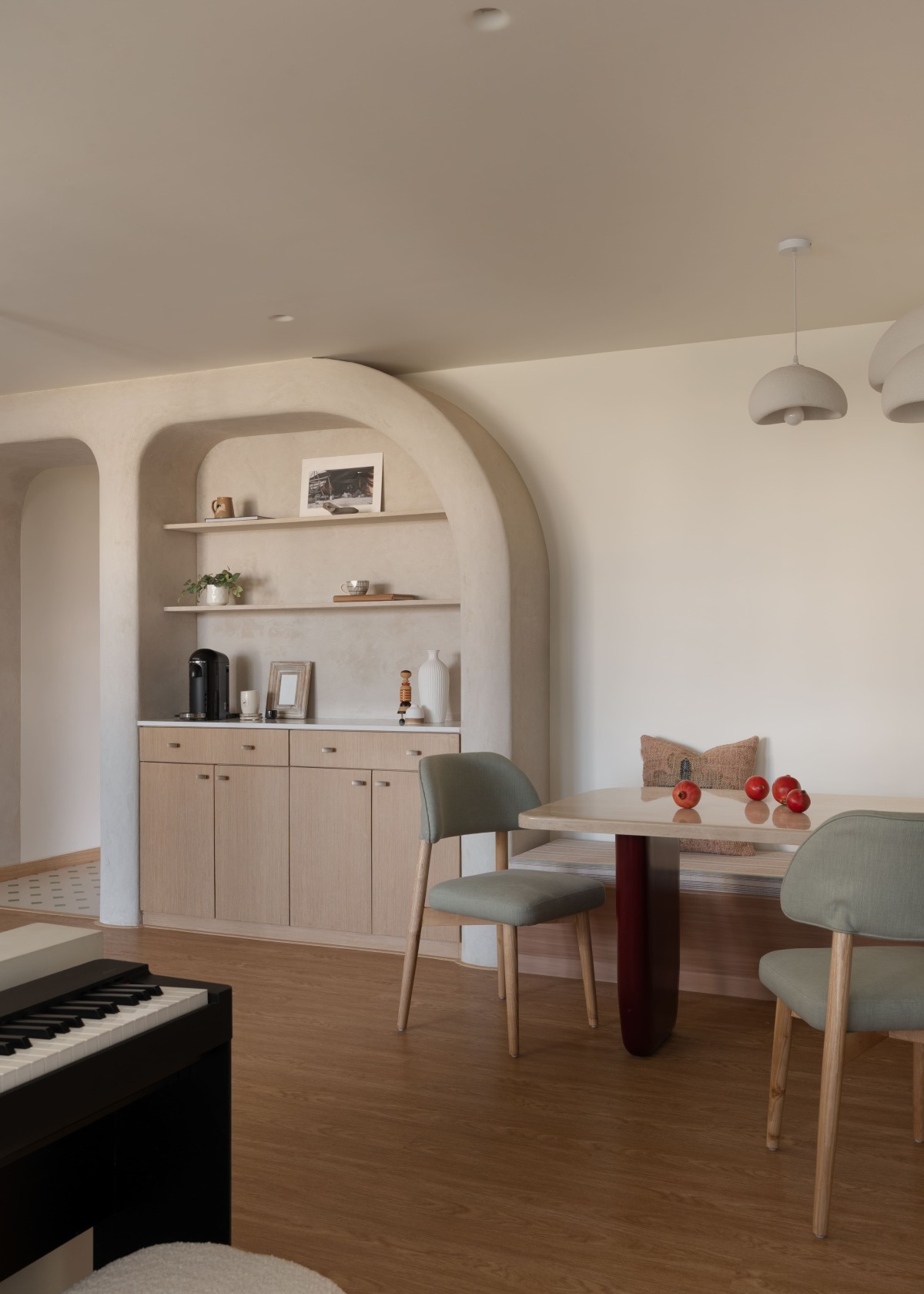 One of the defining elements of the home is the arched niche that frames the dining area, merging display and function through open shelves and a built-in storage zone. It becomes both a sculptural statement and a silent anchor, holding the visual weight of the room with subtlety rather than noise.
