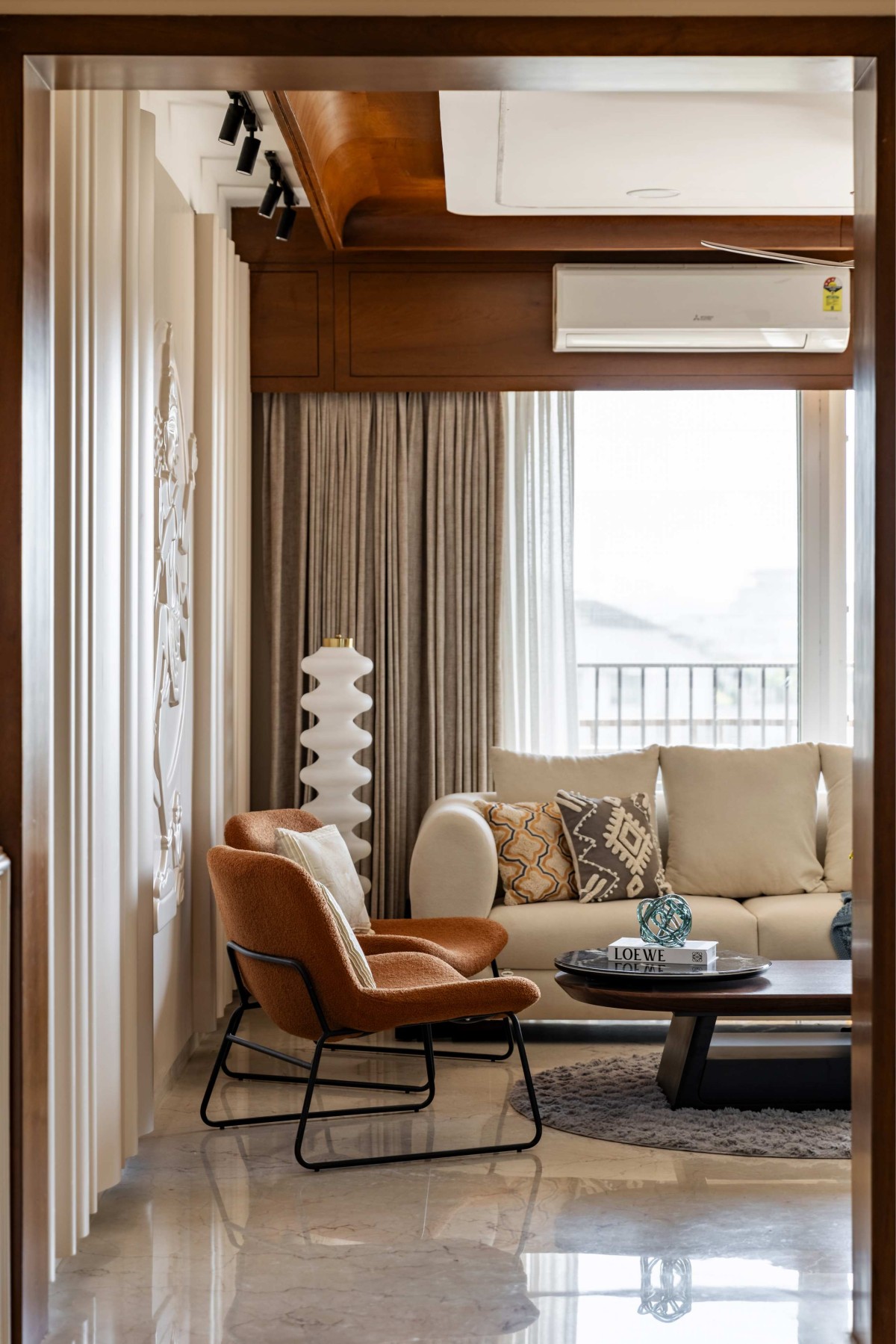 The interiors follow a vibrant yet earthy colour palette, combining soft peaches, warm neutrals, and grounded tones to maintain harmony across spaces. Clean lines, subtle textures, and balanced compositions create an environment that feels sophisticated yet emotionally comforting.