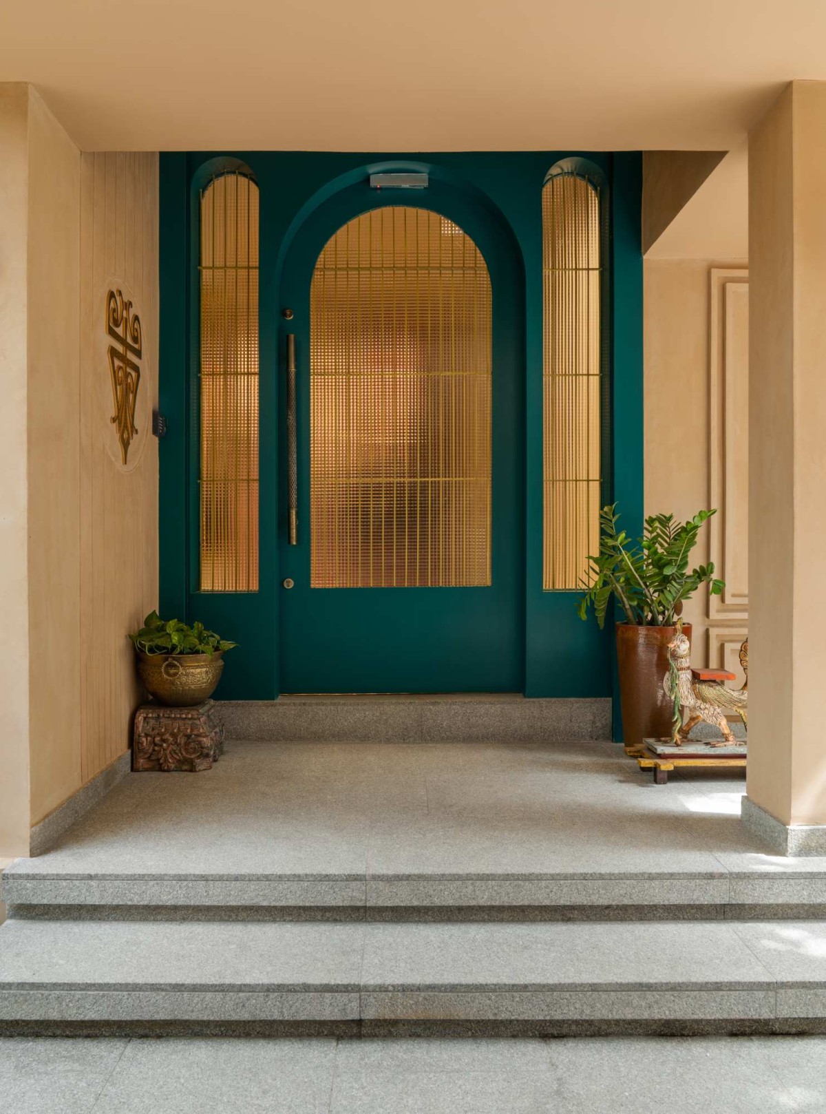 Above, a glass pergola canopy connects the space to the sky. Allowing natural light to flood the corridor, it creates a seamless transition between the built and the organic. At dusk, discreet recessed lighting and wall washers take over, casting warm highlights on architectural details, foliage, and sculptural elements. The lighting doesn’t dominate; it complements—adding softness, focus, and rhythm.