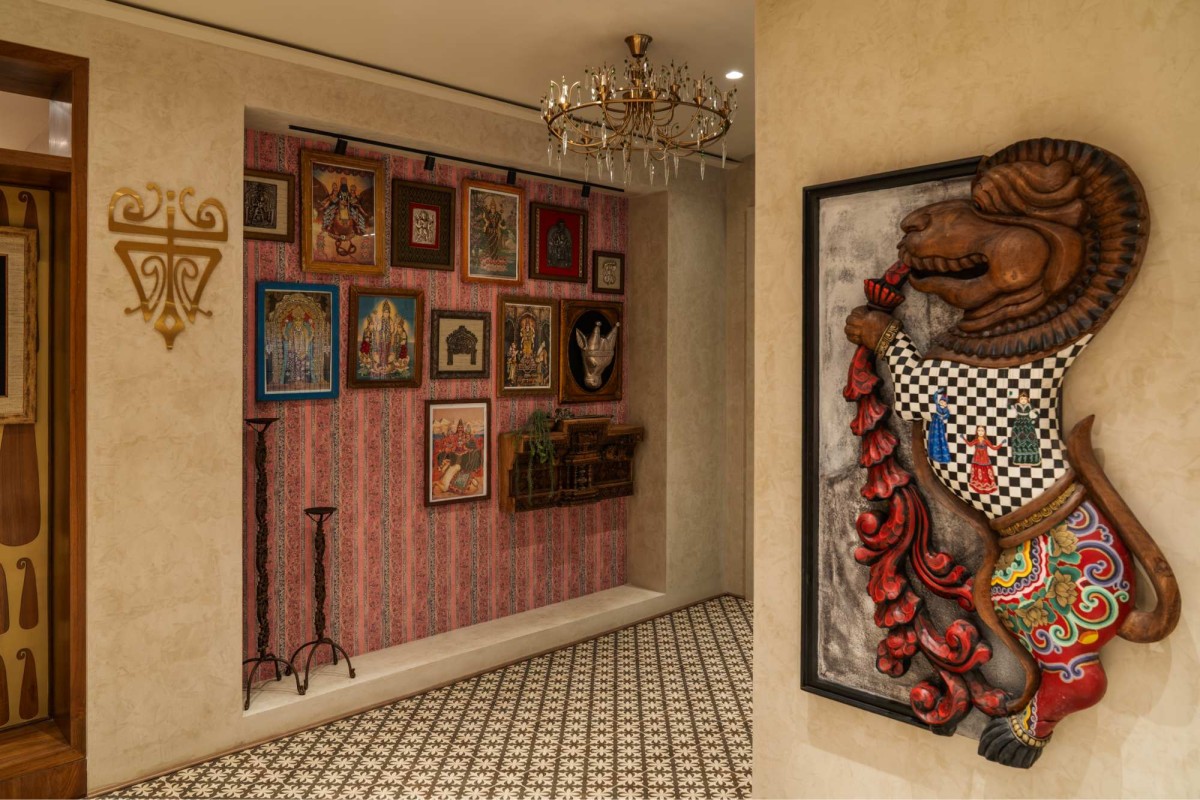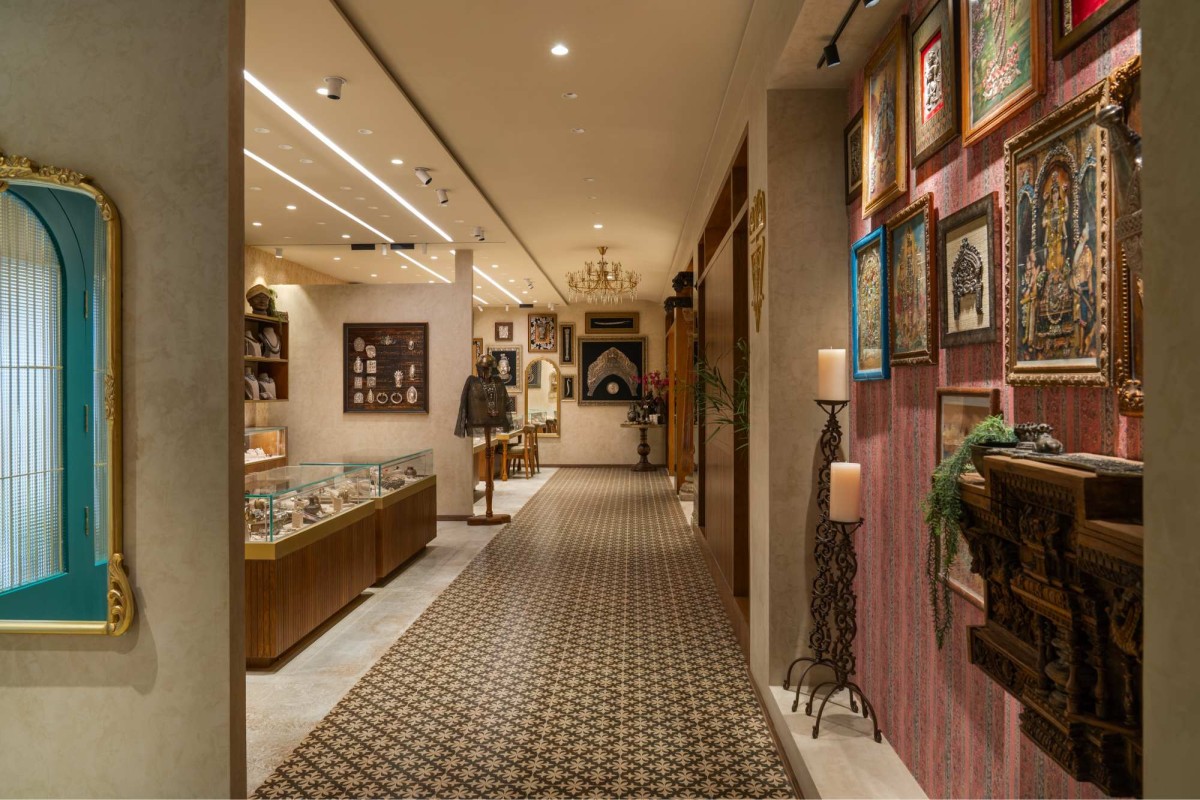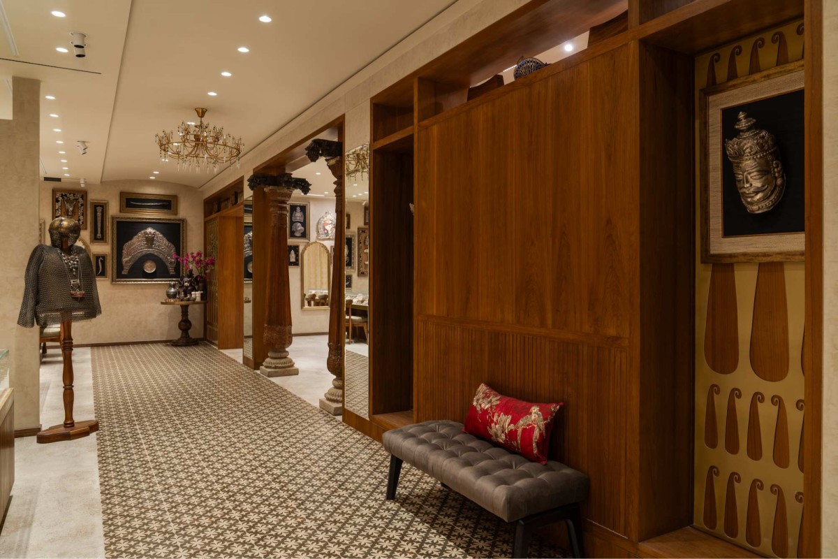 A transitional passage, defined by custom-printed tiles, bisects the floor plan and leads visitors through a linear layout flanked by display counters. Along one wall, an extraordinary installation features antique silver Artefacts which have been collected over the past 30 years by the Founders. Some of the pieces are more than 100 to 125 years old, framed in silk—is a quiet homage to heirloom beauty. Soft furnishings strategically define zones, serving both function and visual comfort, while maintaining a sense of fluidity.
