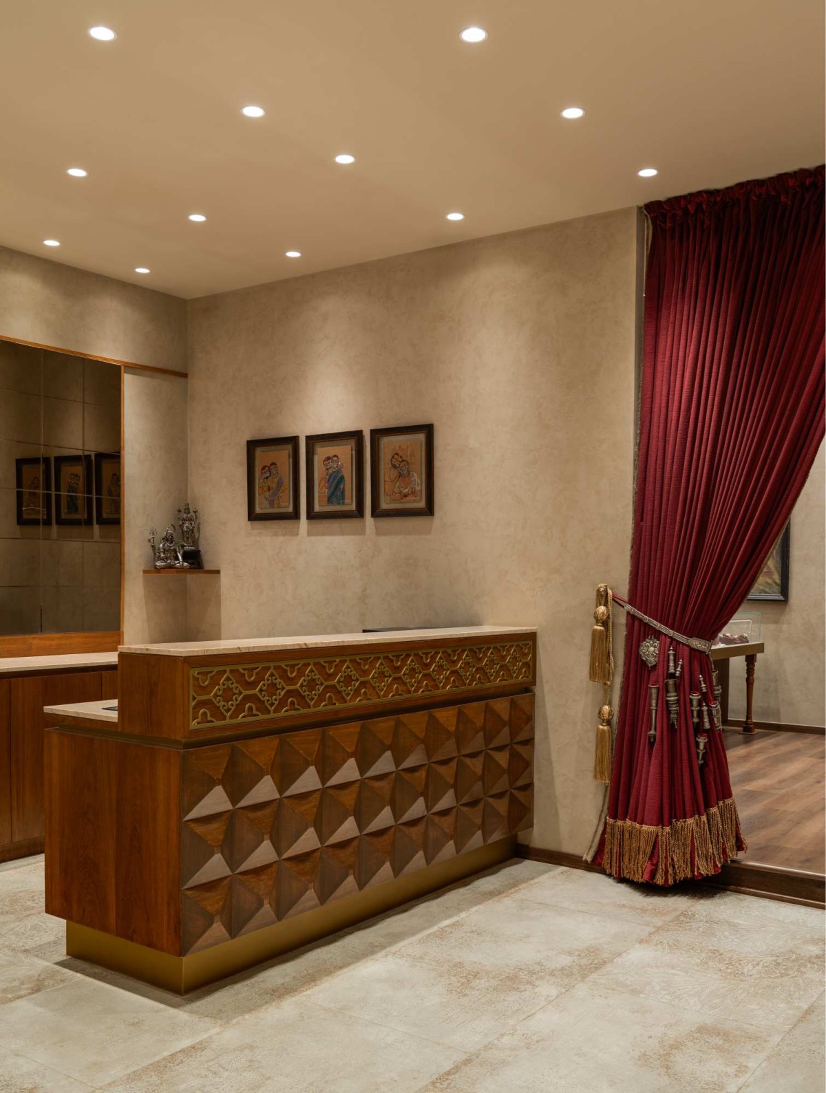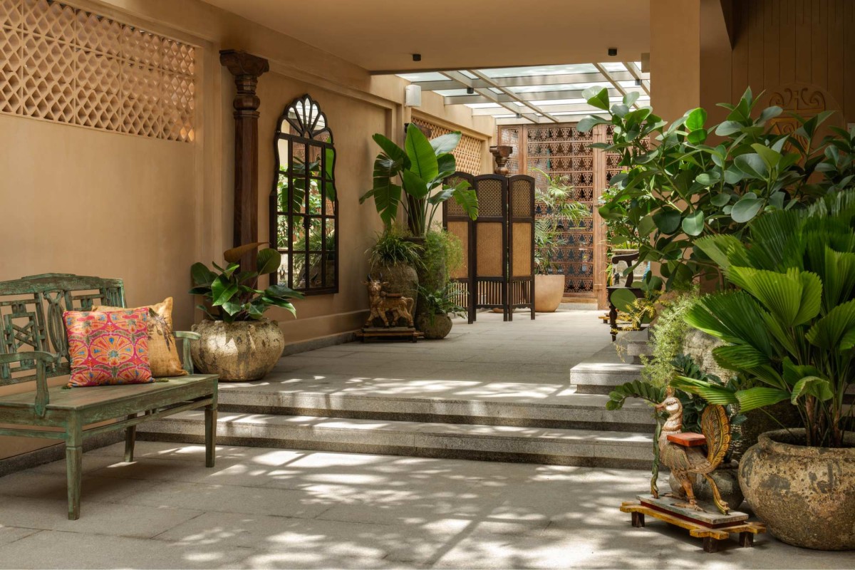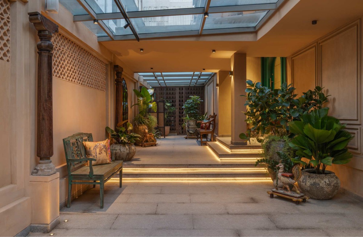 As visitors step through, they enter a curated passageway—a transitional space that quietly builds anticipation. The material palette remains grounded: plastered walls, heritage Chettinad Pillars that follow a Chola Architectural period detailing, and are more than 200 years old, and arched mirror insets add depth, rhythm, and historical layering. The stone flooring gently ascends through subtly lit granite steps, the integrated LED lighting creating a floating effect that guides movement with grace.