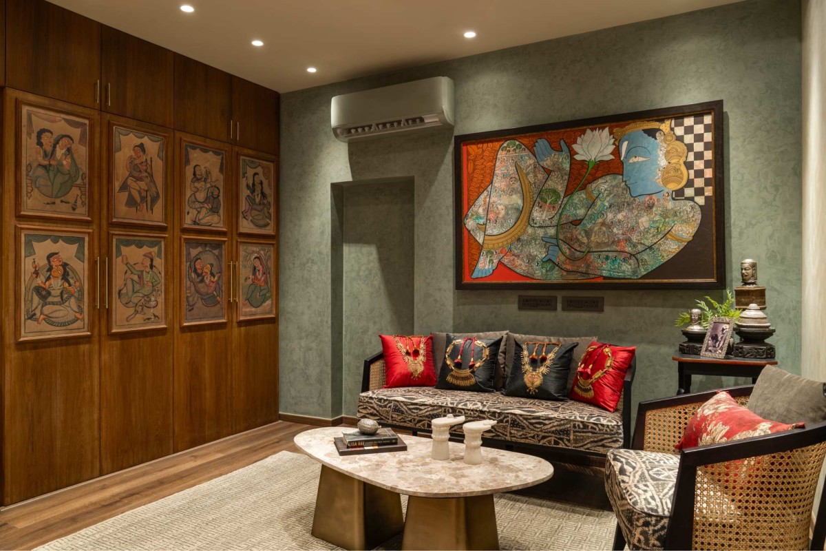 The gold section, placed on a slightly elevated platform, is designed as an intimate consultation zone. Here, form meets function with clever storage solutions that double as art: shutter panels adorned with curated prints turn storage into storytelling. This layered approach—of using display, furniture, and materiality to blur the lines between decor and utility—runs consistently through the space.