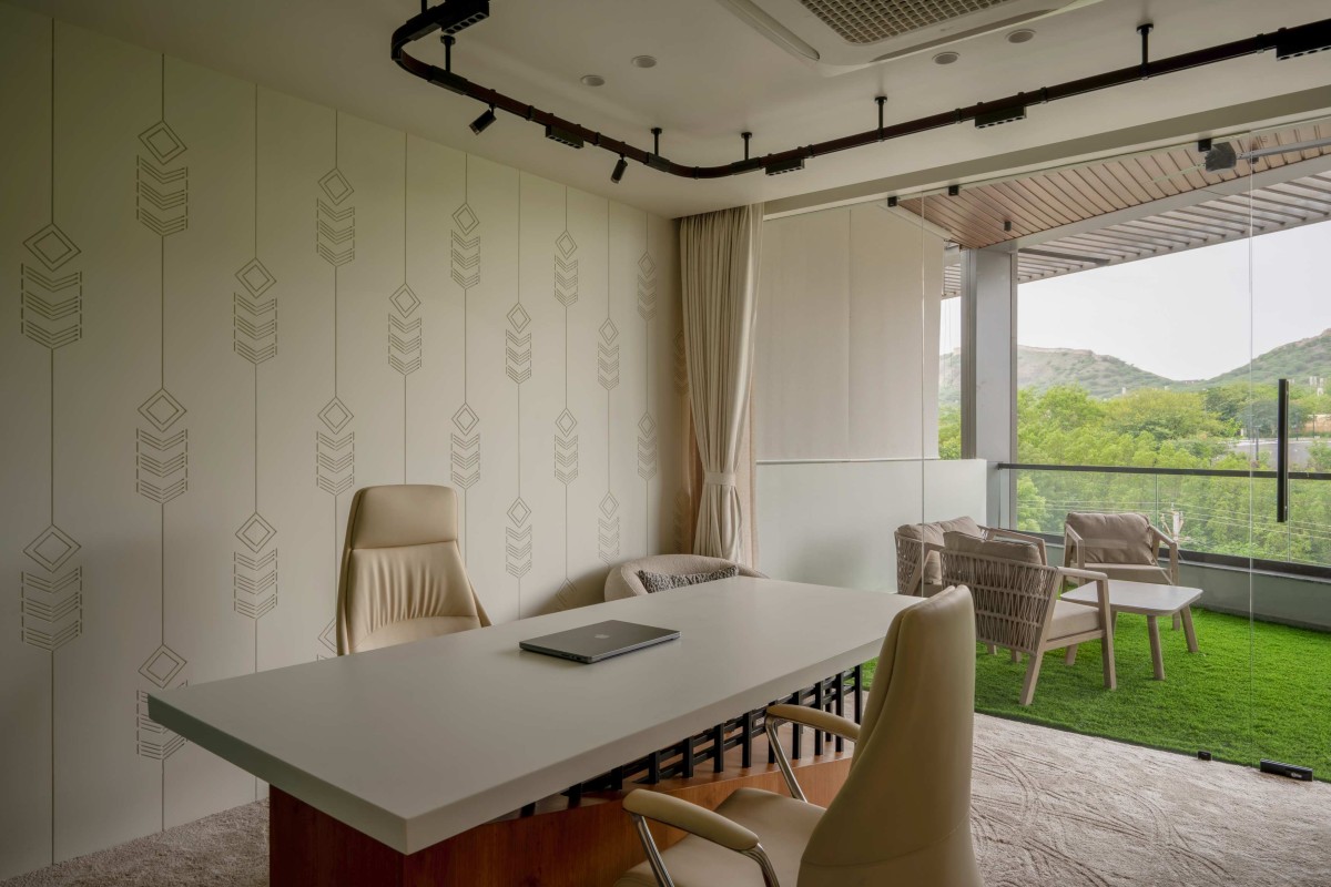 Director's cabin overlooking lush green hill view of Ashapura China-clay Office by Studio Revah