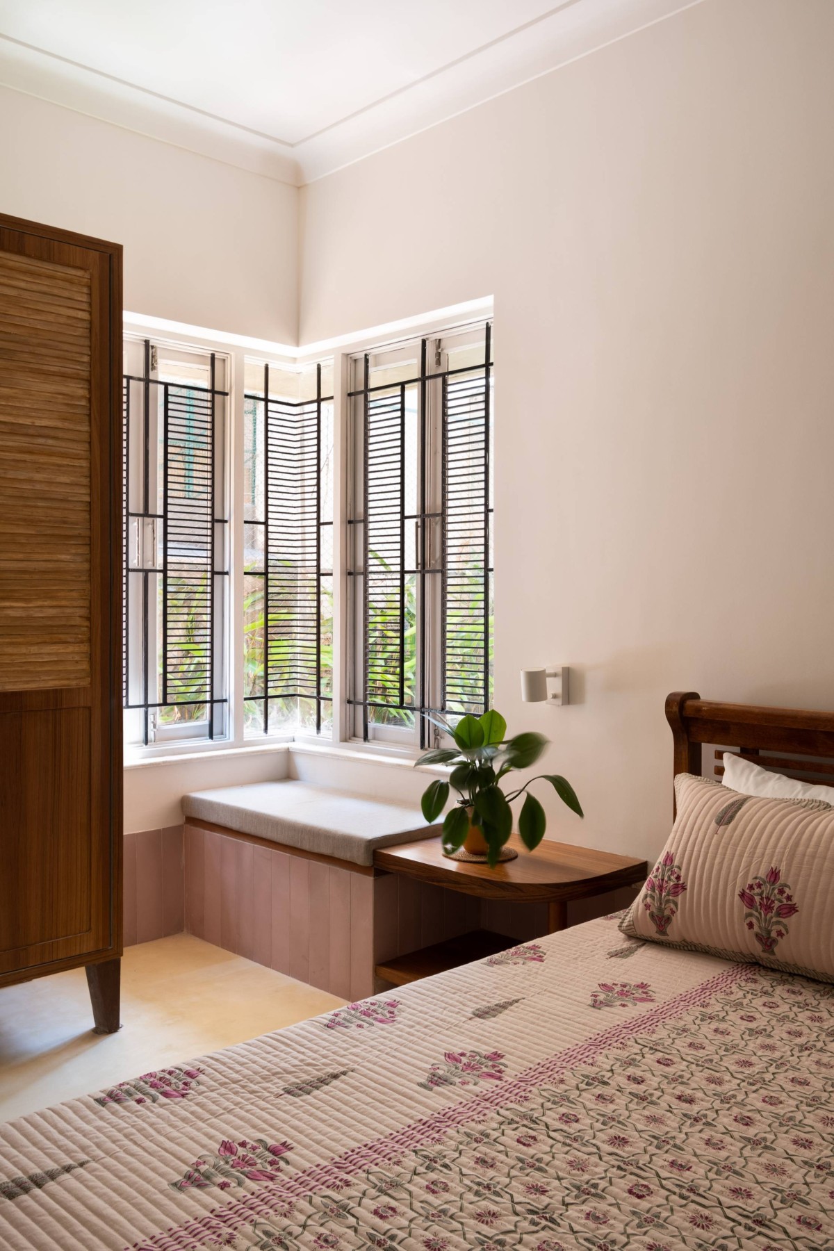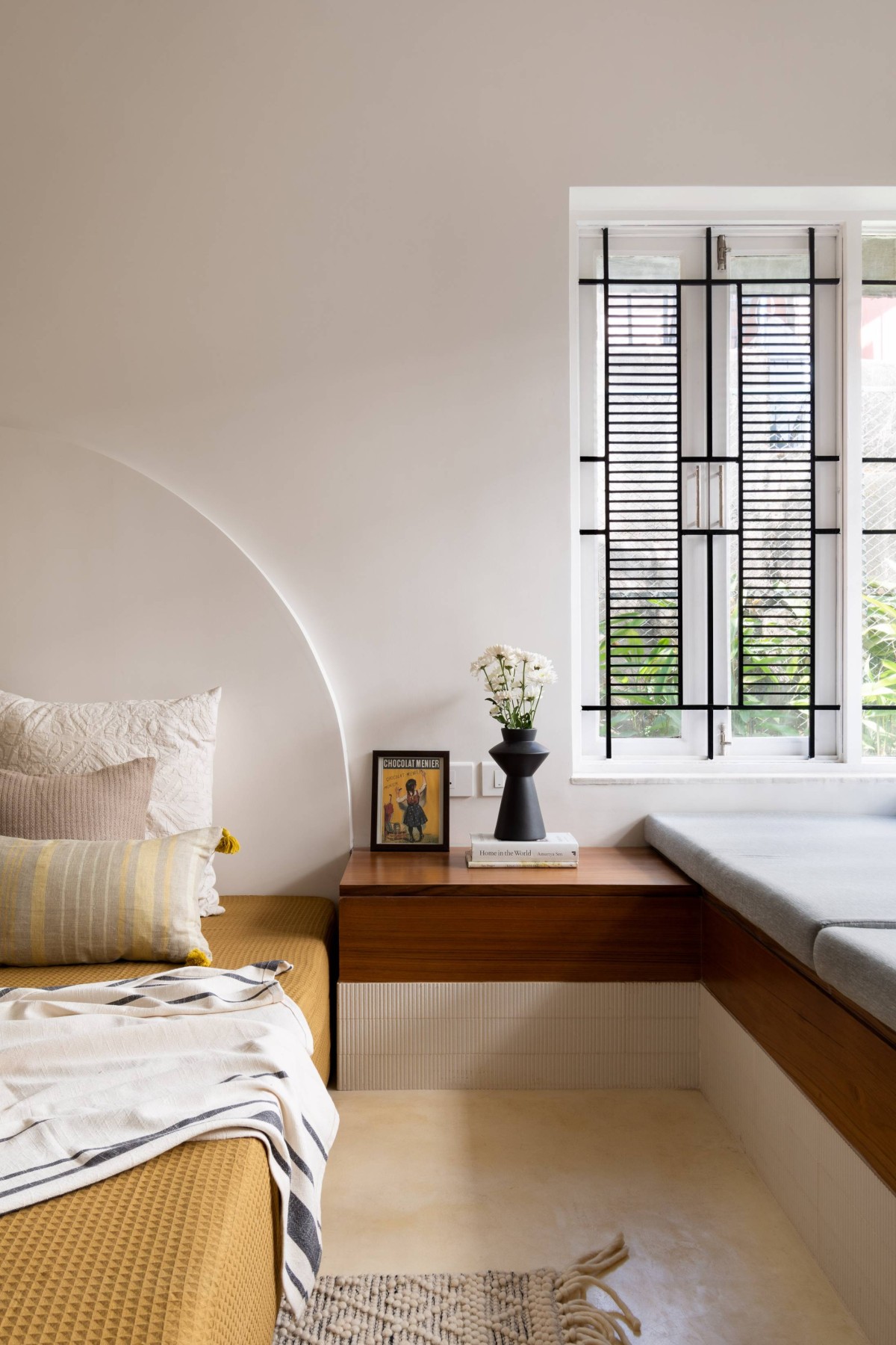 In the Guest Bedroom, an arched headboard emerges almost seamlessly from the wall, covered in the same texture, creating a sculptural but tranquil element. The Master Bedroom comfortably accommodates a king-sized bed and boasts a large wardrobe with bamboo shutters, seamlessly blending functionality with design.