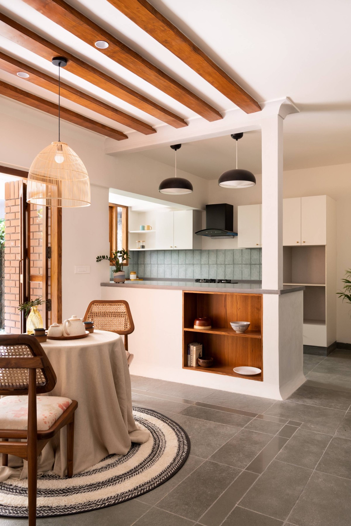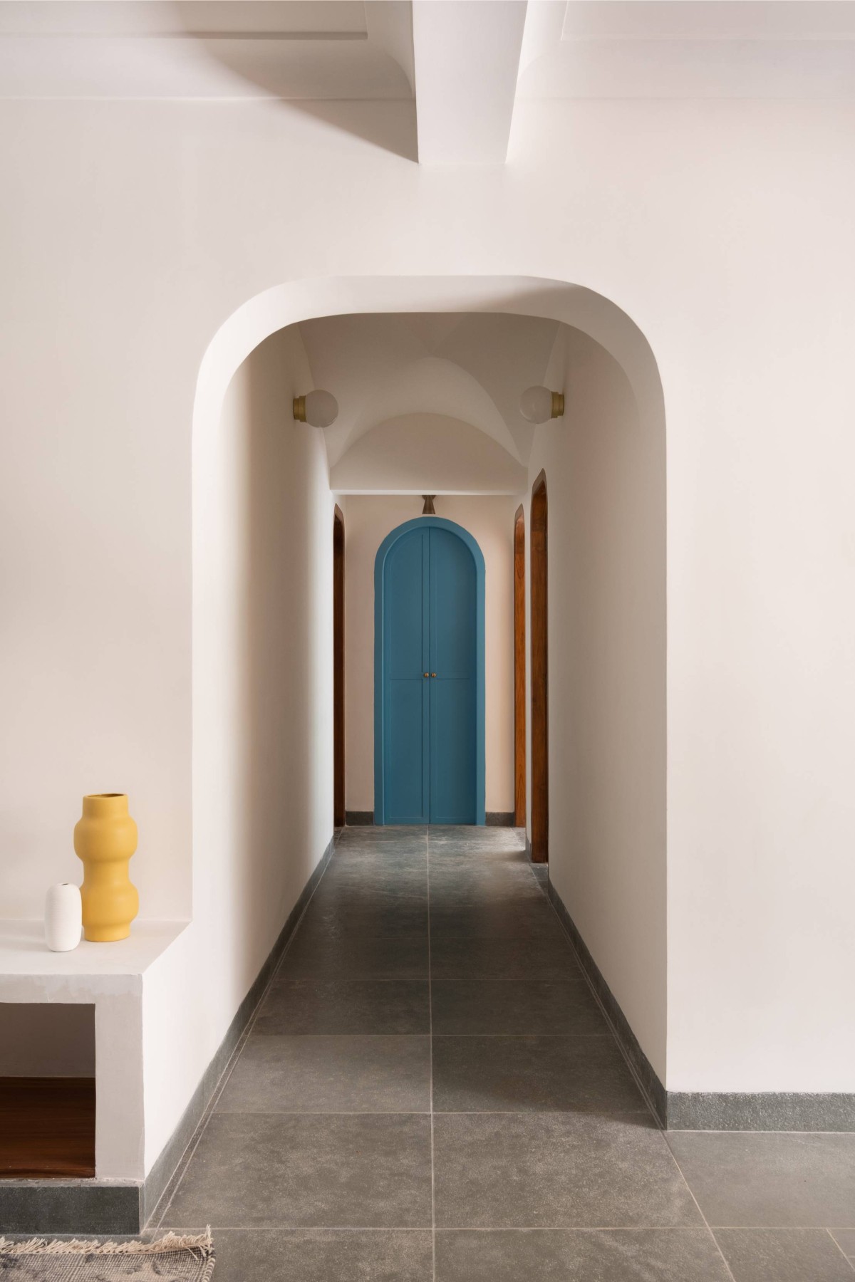 The Living Room is anchored by a long built-in TV unit that spans an entire wall. Adjacent to it, a cozy four-seater dining area looks out onto a lush garden, bringing nature into the heart of the home. The open kitchen, connected directly to this space, is designed with white cabinetry, a blue tile dado, and a cream-toned quartz countertop, making the space feel clean, fresh, and efficient. Between the Living and Dining lies a transitional passageway that concludes with a striking arched blue door leading to the Guest Bathroom. This corridor features a subtle ceiling vault — easily overlooked at first glance, but once noticed, it becomes a quiet highlight.