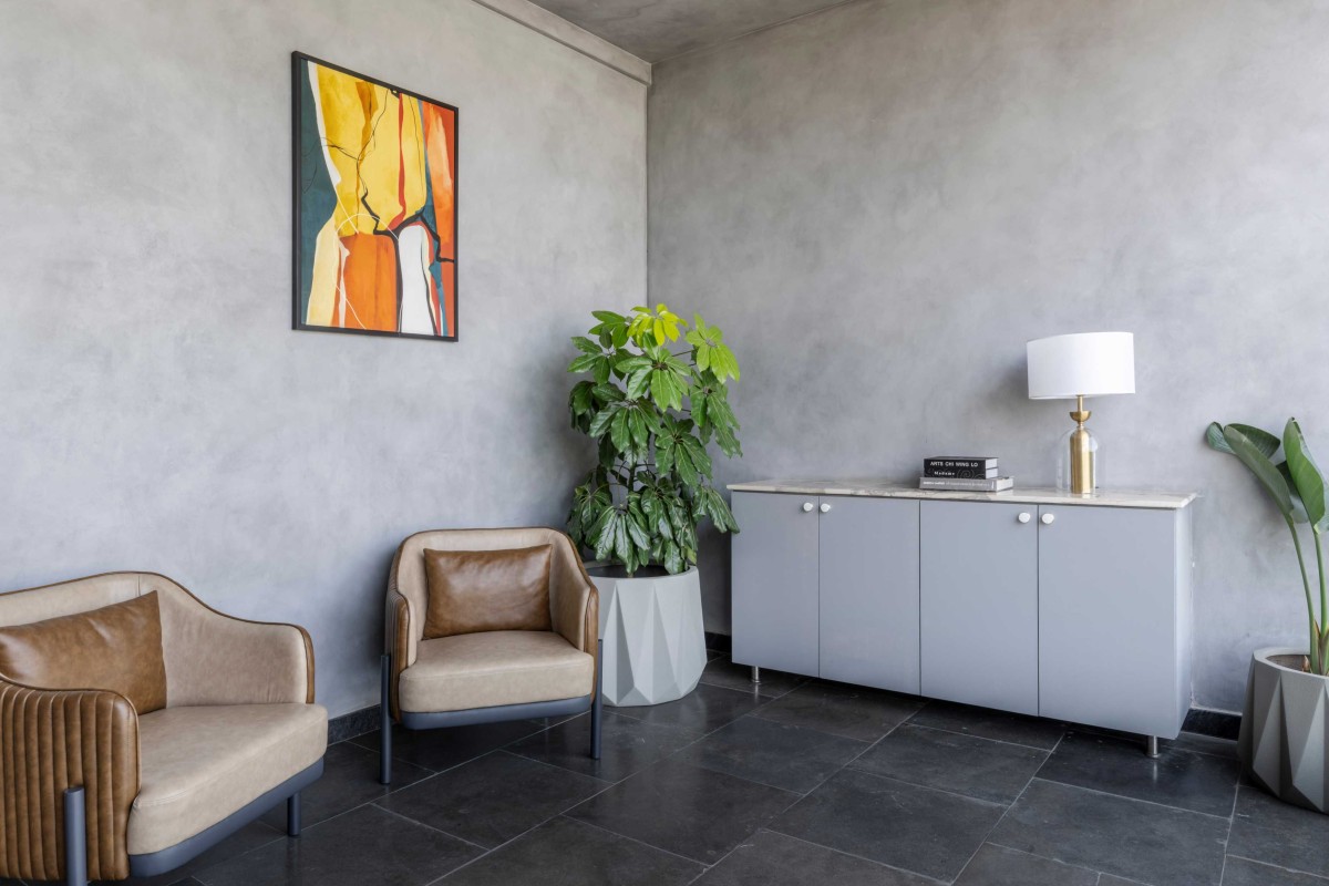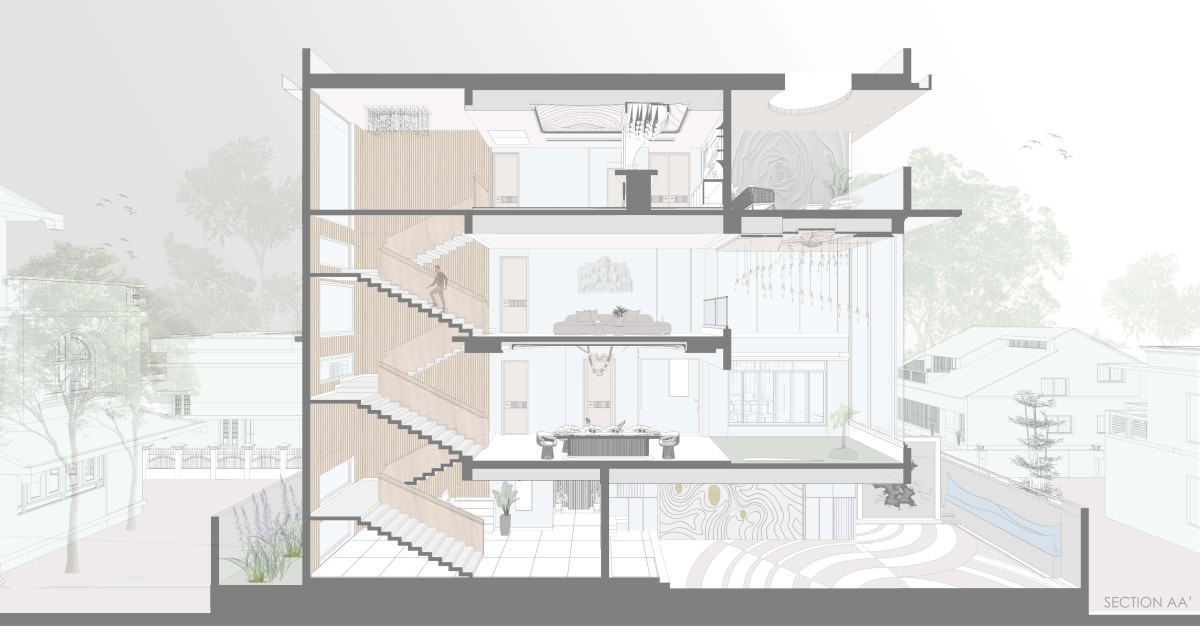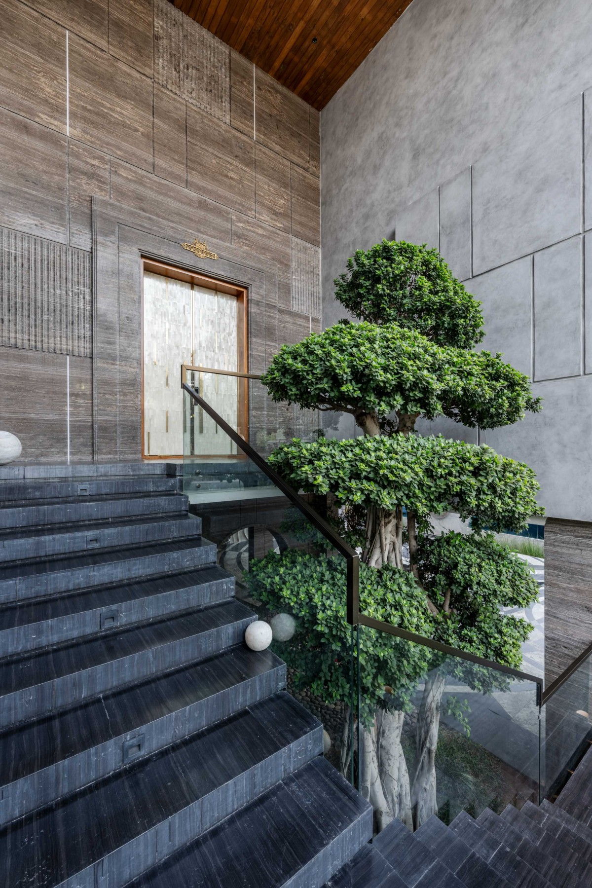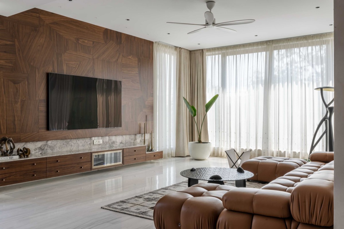 Entering through the wooden-clad gate, visitors are greeted by a striking mural wall, where a human figure appears to emerge from the surface. Adjacent glass panels, resembling sea waves above a bed of grass, pay homage to the client’s coastal roots. The residence offers two distinct entry points. The primary route leads visitors beneath the cantilevered drawing room, past a majestic tree set within the triple-height core, before arriving at the grand main door. The secondary entrance from the stilt-floor parking area opens into the lift lobby. Both entrances feature identical Celestine stone-clad doors with brass accents, reinforcing the home's cohesive design language.