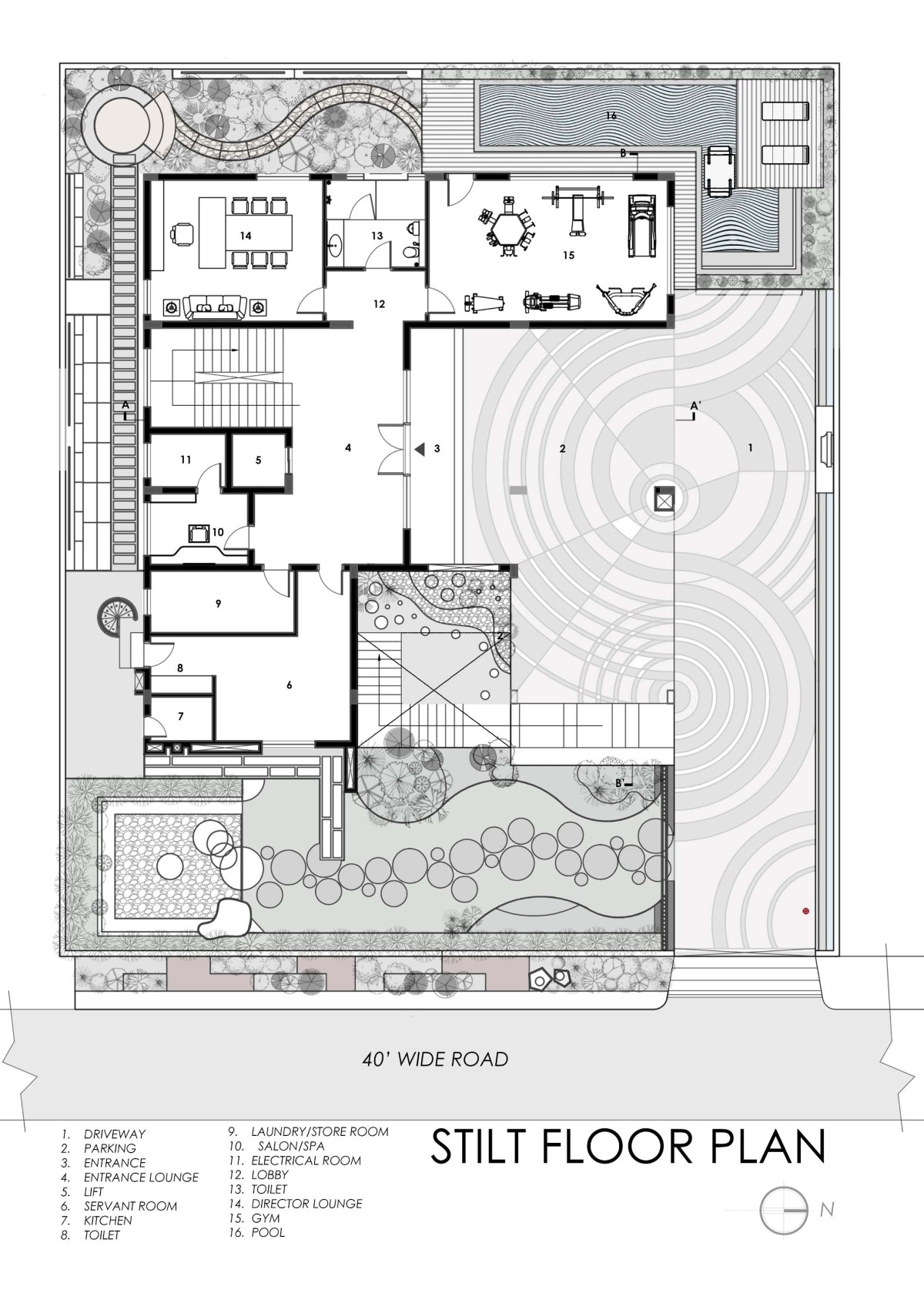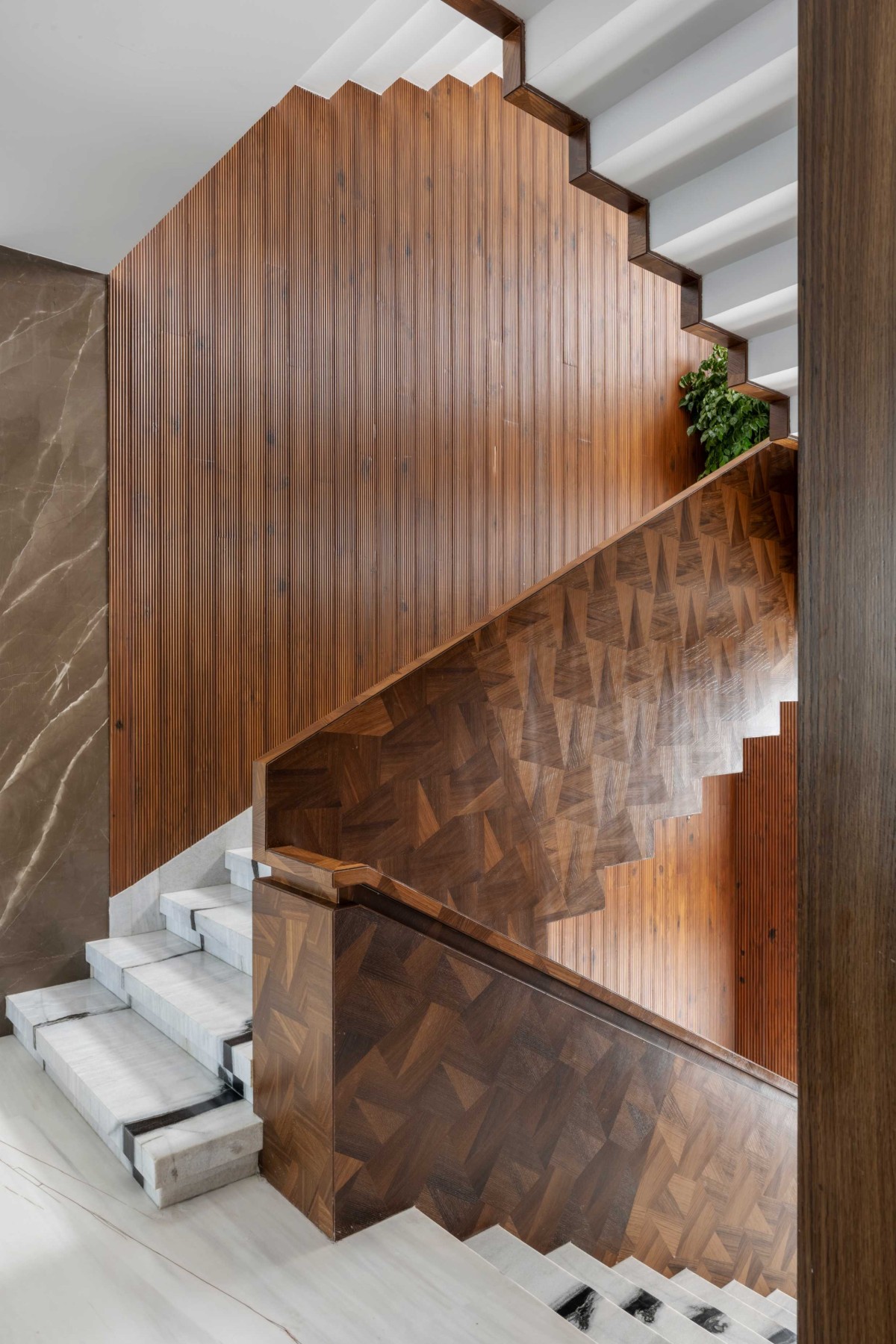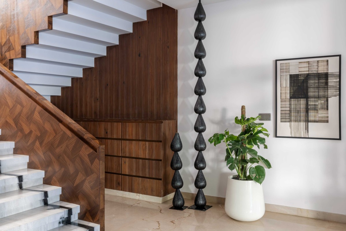 The stilt floor unfolds as a functional yet inviting space, with a lift lobby clad in Patagonia quartzite, complemented by a brass-finished lift and a statement glass chandelier. A white Panda marble staircase, bordered by fluted wooden panelling and a solid wooden railing with designer veneer, draws the eye upward. The floor accommodates practical spaces such as a home office, gym, steam room, and swimming pool.