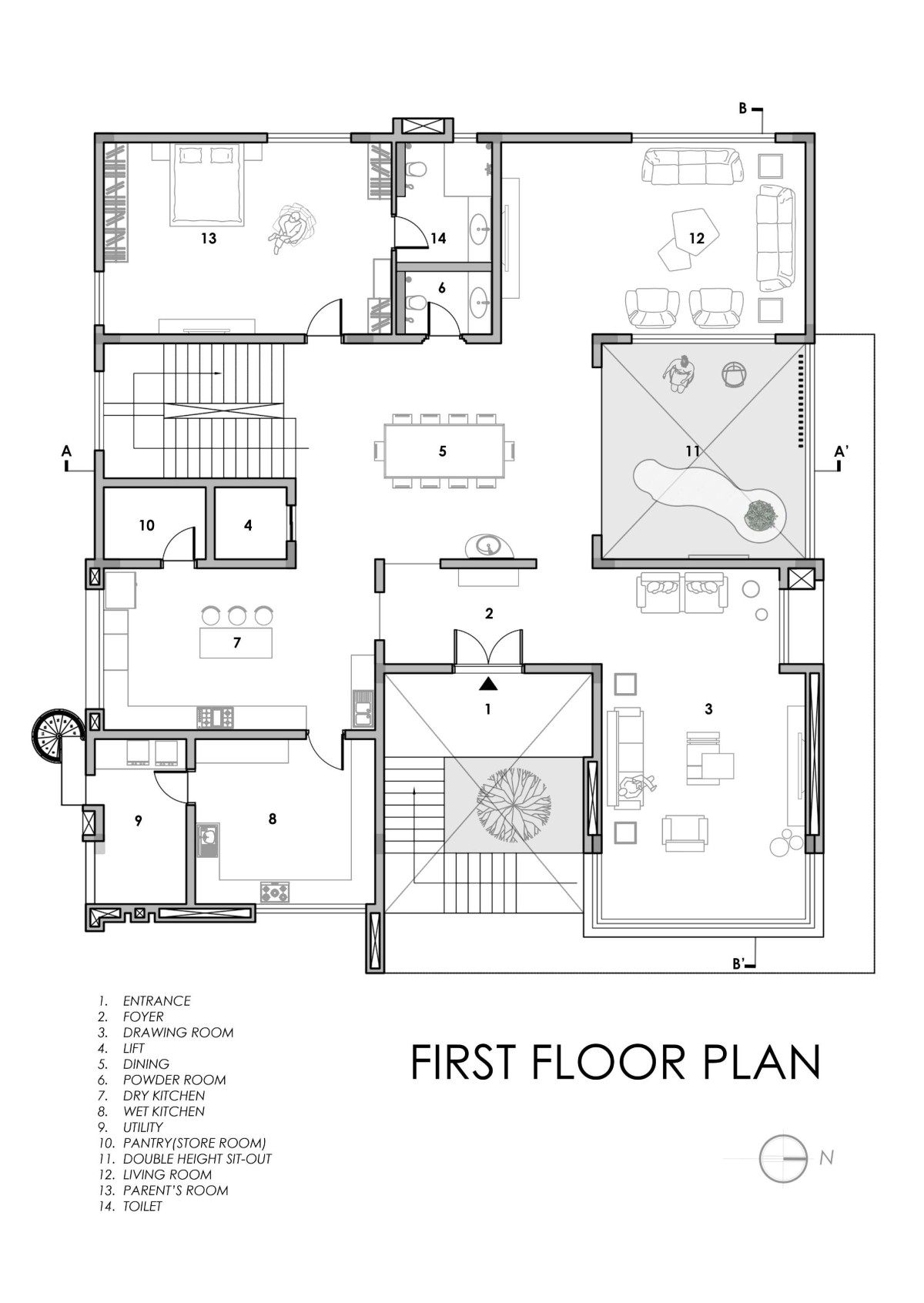 Ascending to the first floor, the foyer introduces brass butterfly accents and a console table. The adjacent drawing room features a grand U-shaped floor-to-ceiling window that overlooks the road, inviting natural light to cascade across the interiors. Behind the foyer, the dining space centers around a stunning 10-seater green quartzite table. One side opens to the lift and staircase, while the opposite side reveals a captivating double-height sit-out — the residence’s beating heart.