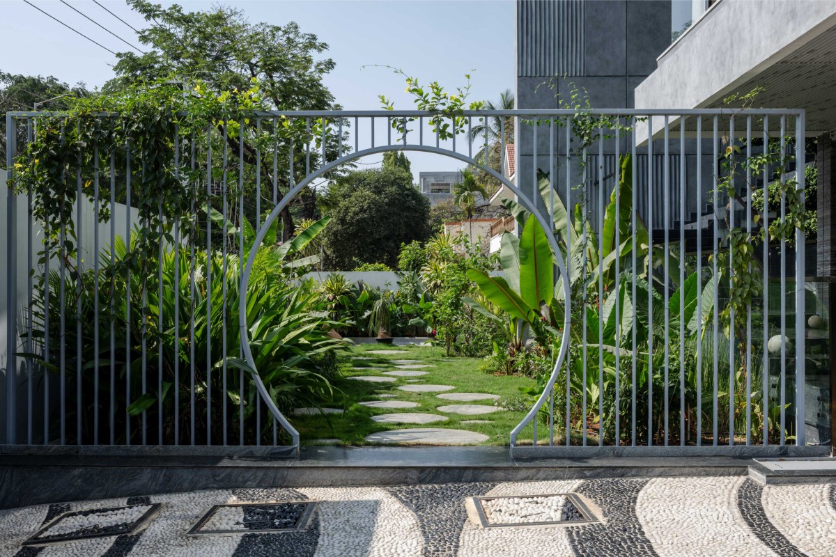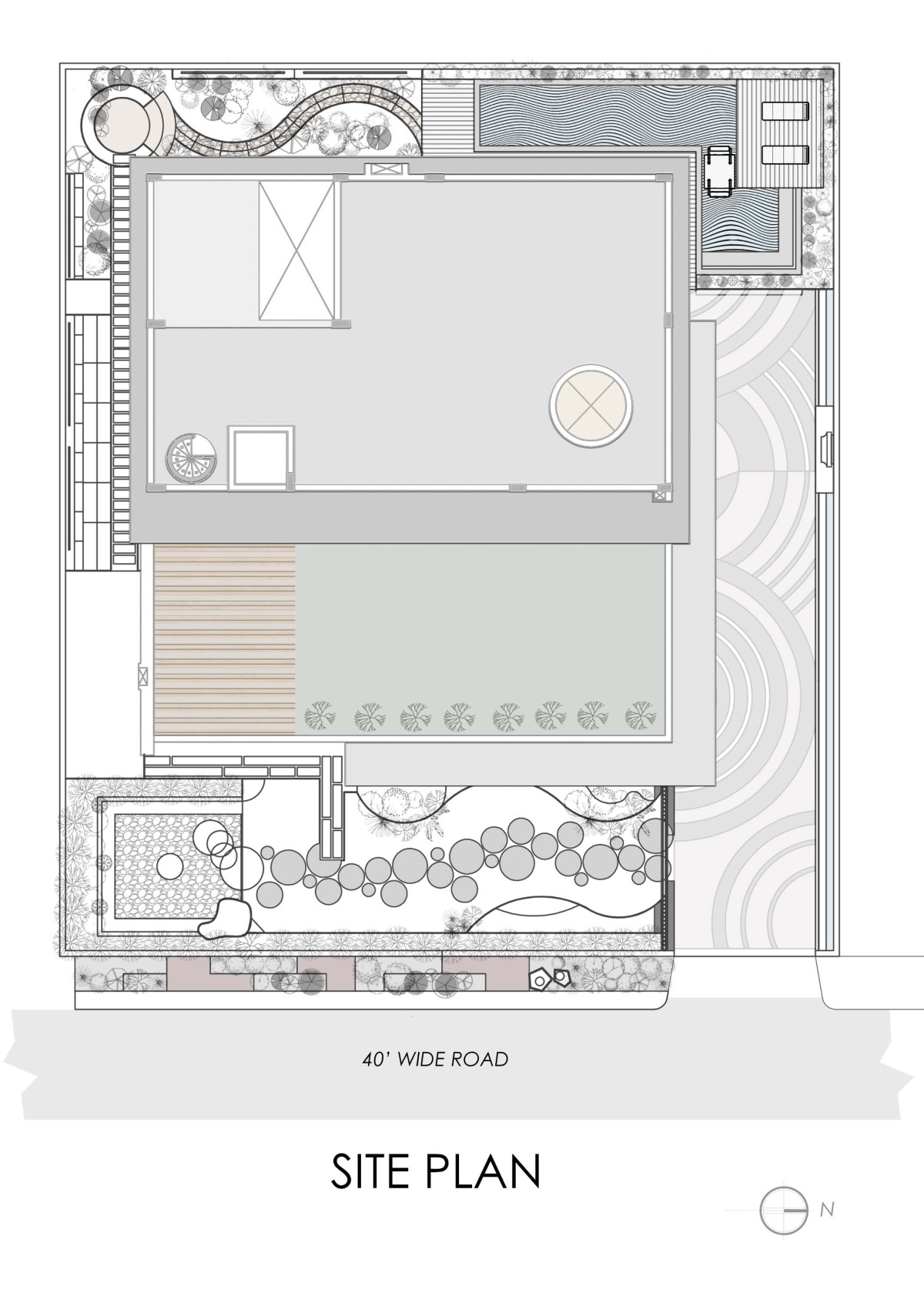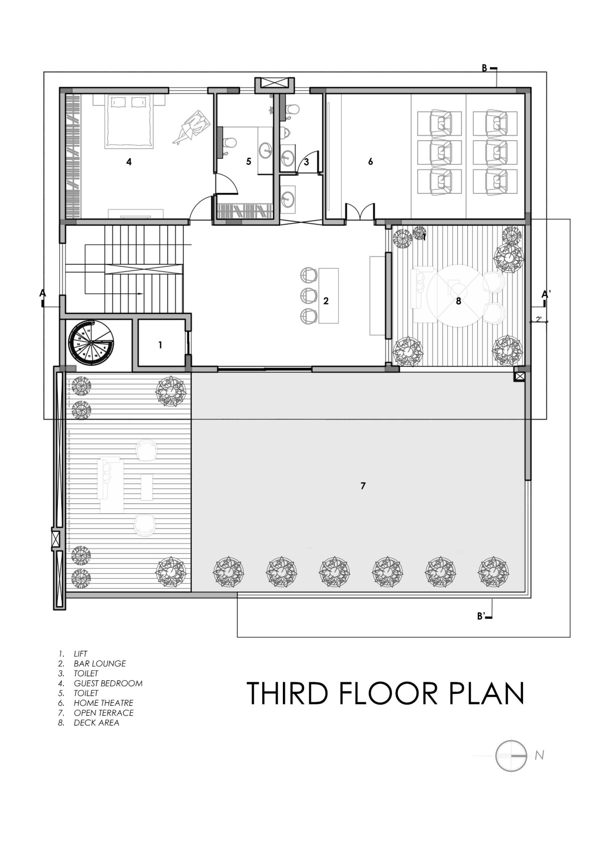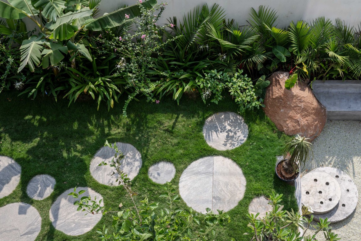 The home theatre embraces a futuristic design language, while the terrace offers two inviting seating decks. One deck features a circular skylight, a lotus-inspired mural, and lush greenery — an idyllic relaxation spot. The second deck, designed for party buffets, is defined by a stone backdrop wall and a pergola that completes the elegant outdoor setting.