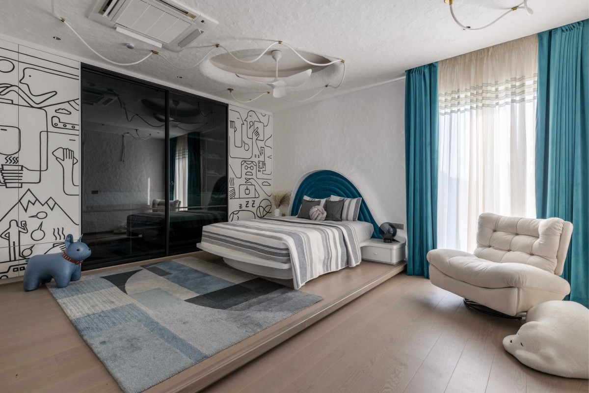 Two additional bedrooms for the client's sons flank the Puja space. The younger son’s room presents a bold black-and-blue palette with ombre-finish walls, while the elder son’s room features warm wooden tones, a plush headboard, and black back-painted glass. A wallpaper resembling a city map and a skyline motif on the washroom's blinds complete the elder son’s space.