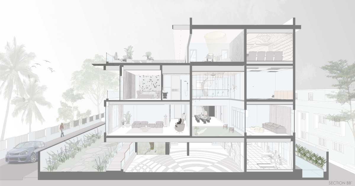 From the very first glimpse, B Haus reveals itself as a commanding presence — a 14,000 sq. ft. residence that stands as a testament to scale and elegance. Its core is defined by a triple-height volume, crowned with a cantilevered slab clad in thermopine wood — a bold architectural statement that anchors the design.