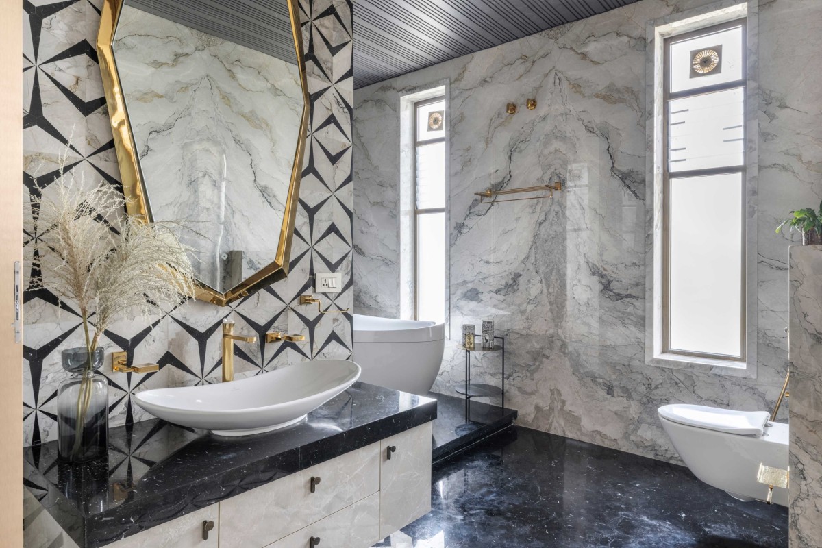 The living area overlooks the sit-out, fostering a seamless indoor-outdoor connection. The dining space is further enriched with a designer washbasin and a mirror from White Domus. The powder room surprises with a bold Bisazza glass mosaic panel. The parents' bedroom embraces a neutral palette with designer veneer accents, while the attached washroom channels a retro-inspired aesthetic with distinctive patterns and fittings.