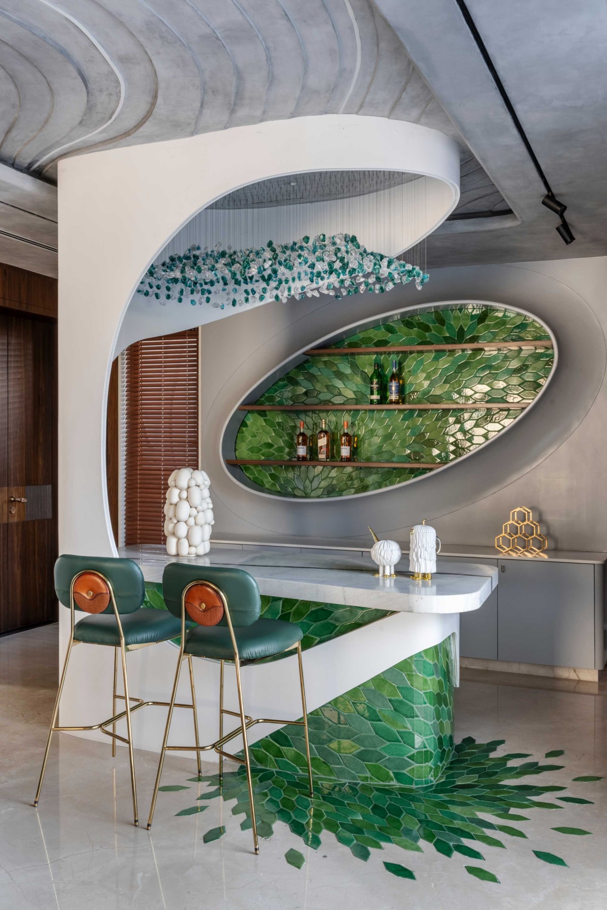 The third floor is designed for leisure and social gatherings, featuring a bar lounge, home theatre, guest bedroom, and terrace decks. The Santorini-inspired guest bedroom showcases textured walls, blue accents, and neutral wooden flooring, with a wardrobe featuring single-line artwork by an artist. The bar lounge combines grey lime-plaster ceilings, white Corian finishes, and green handmade tiles. The sculptural bar unit flows organically from ceiling to floor, highlighted by a flex light installation and surrounded by green and white pebbles — a statement center piece for the floor.