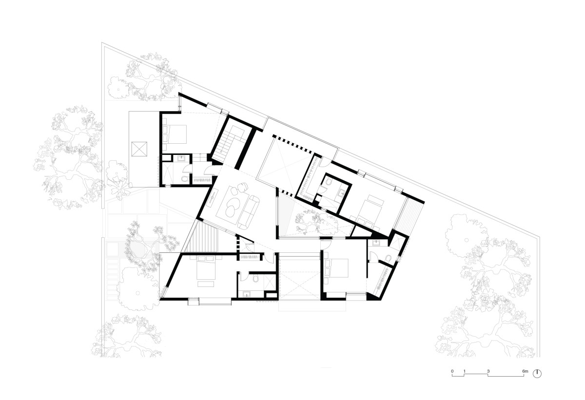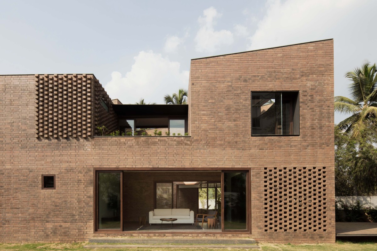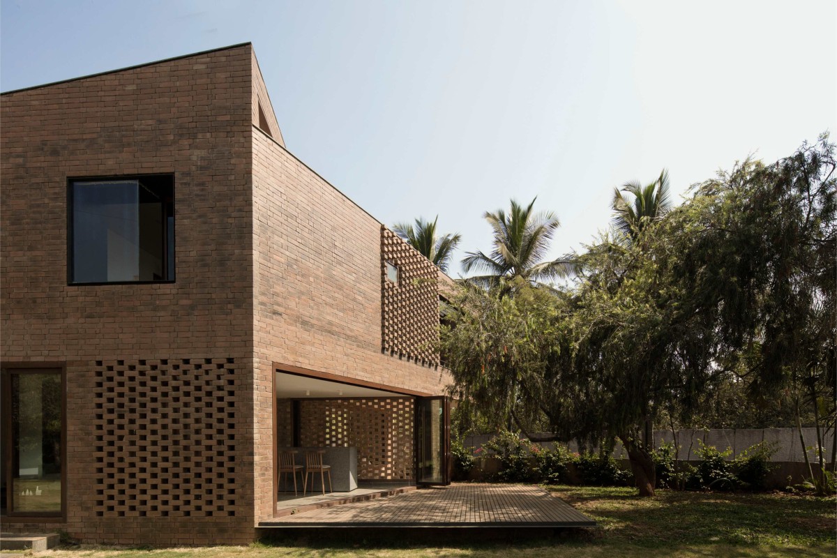 Located in a major tech suburb of Bangalore, that until 15 years ago was open farmland, this project strives to create a quiet retreat for a young family of five in an otherwise densely populated and unplanned community. Constructed on the foundation of a small brick house that the family had outgrown, the new design builds off of the existing palette and angled plinth to create a personal narrative of open and interconnected spaces that challenge the standard assumptions of load-bearing brick construction. Using hand-moulded table bricks with natural variations, this project celebrates the imperfection of the material and the manner in which it is laid. The tension between traditional building methods and contemporary geometries is softened by the introduction of porous jaali screens and the contrasting shadow patterns of partial brick projections. A small triangular courtyard at the centre of the home is formed as a reminder of the original foundation and history of the site, creating complete porosity between inside and out and a visual connection between public and private spaces.