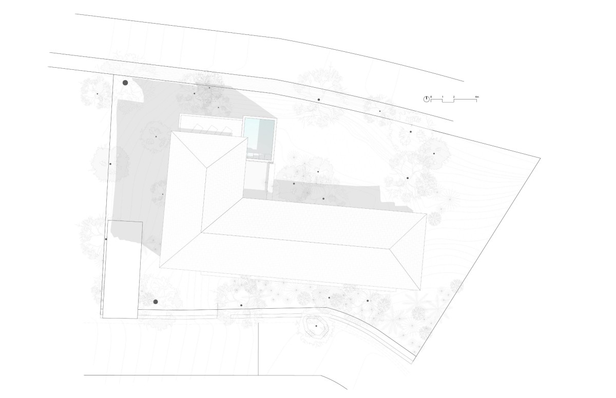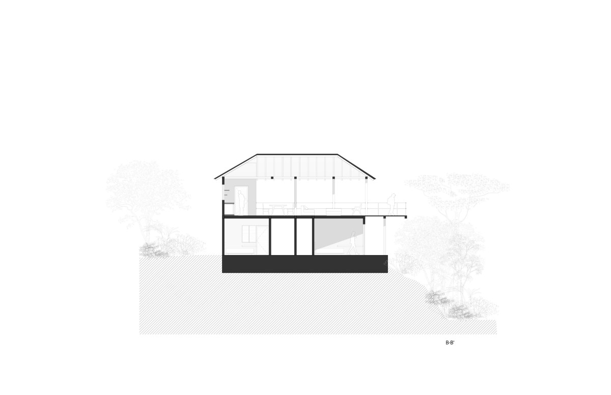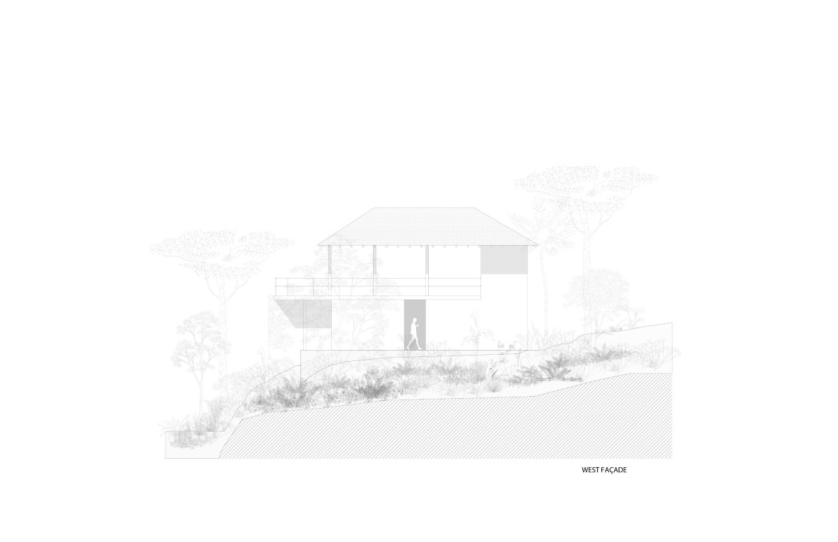 Built into a hillside, the house rises from a solid base that connects it to the land. The lower level is more enclosed, with carefully placed windows and openings to capture views, encourage cross-ventilation, and offer shade from the sun. Above, a lighter structure sits on top, creating a balance between the two levels and clearly defining the different spaces within the house.