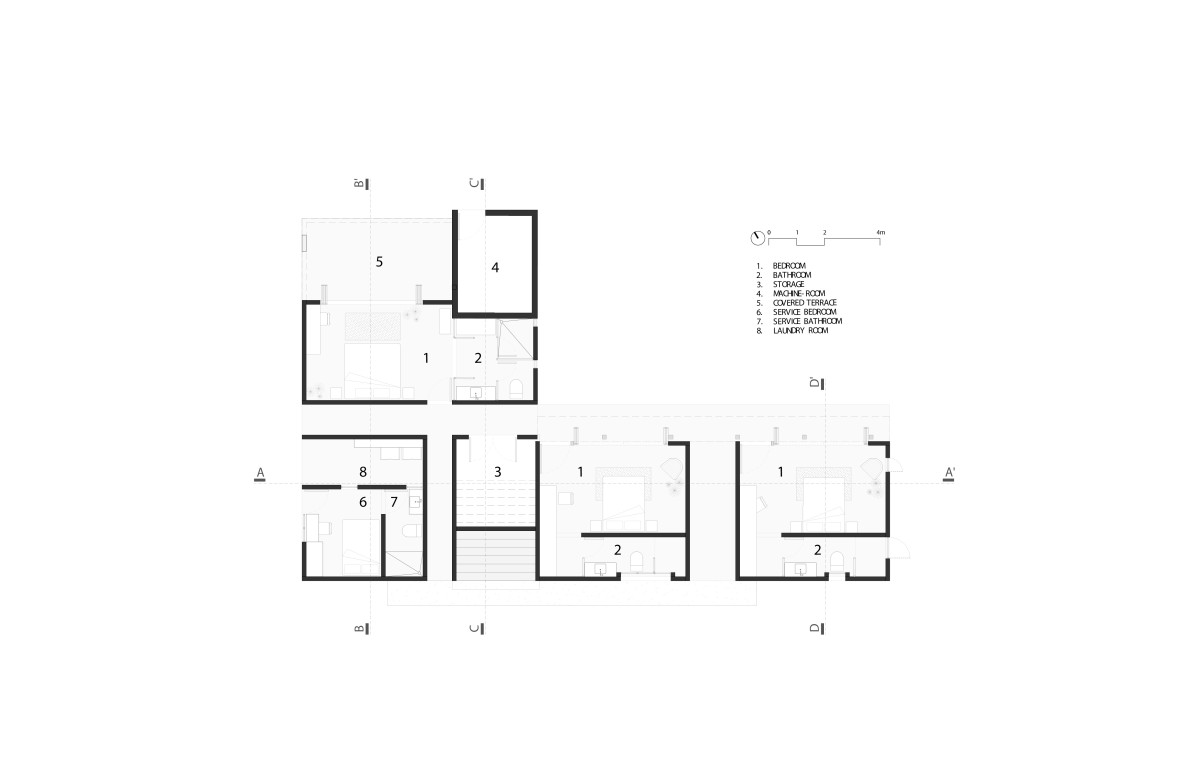 On the lower level, three guest rooms and the service area are connected directly to the garden, allowing for easy access to the outdoors. The upper level opens up to expansive views, with the main living areas feeling like an extension of the landscape. The master bedroom is located near the social spaces, making daily movement through the house easy and natural.