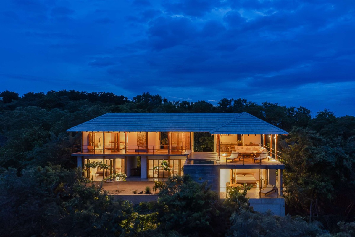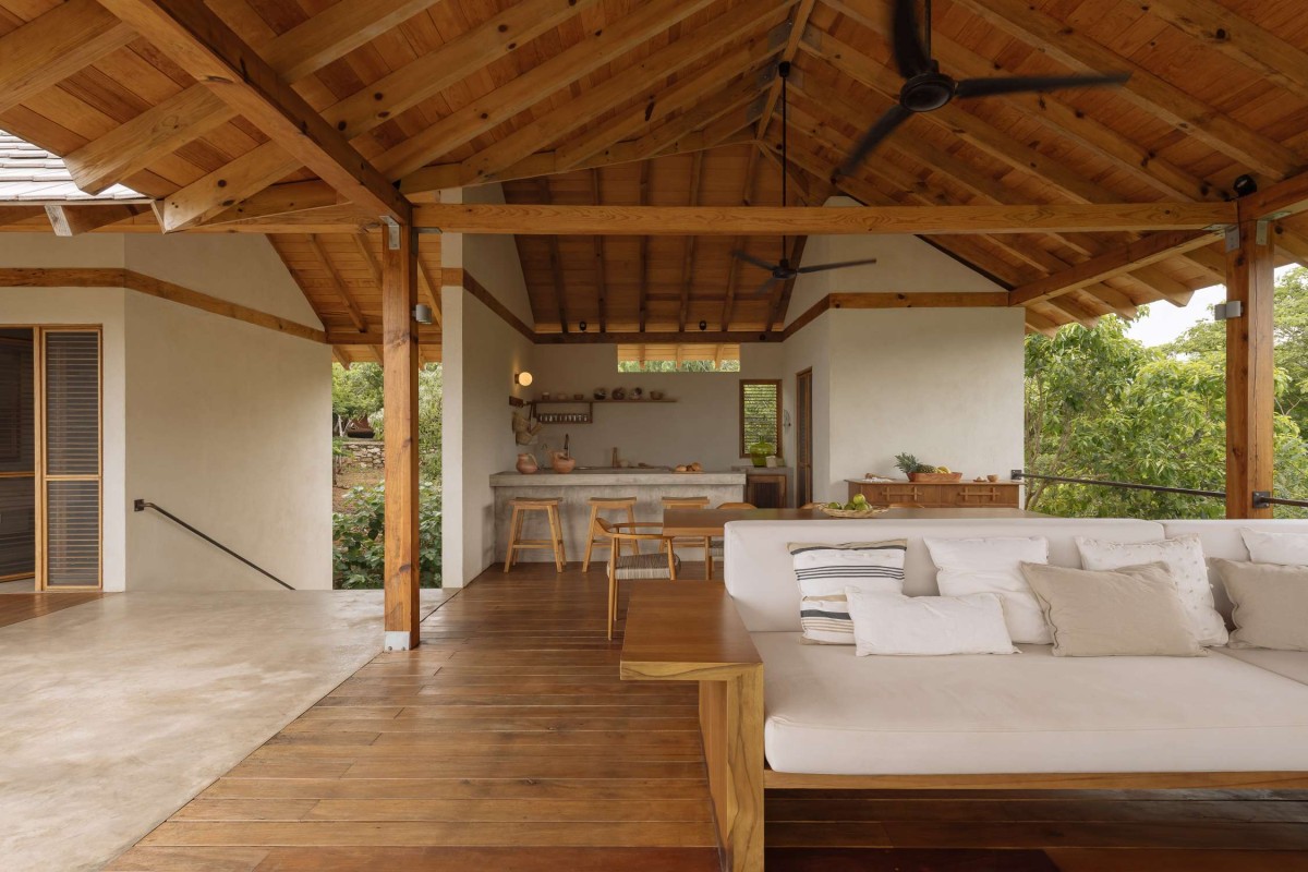 The house takes advantage of panoramic views, carefully planned pathways, and practical protection from the elements. A large, expressive roof, inspired by the traditional palapa, serves as the key architectural feature. Light and airy, the roof provides shade from the sun and shelter from the rain while allowing for natural airflow, keeping the spaces cool and comfortable.