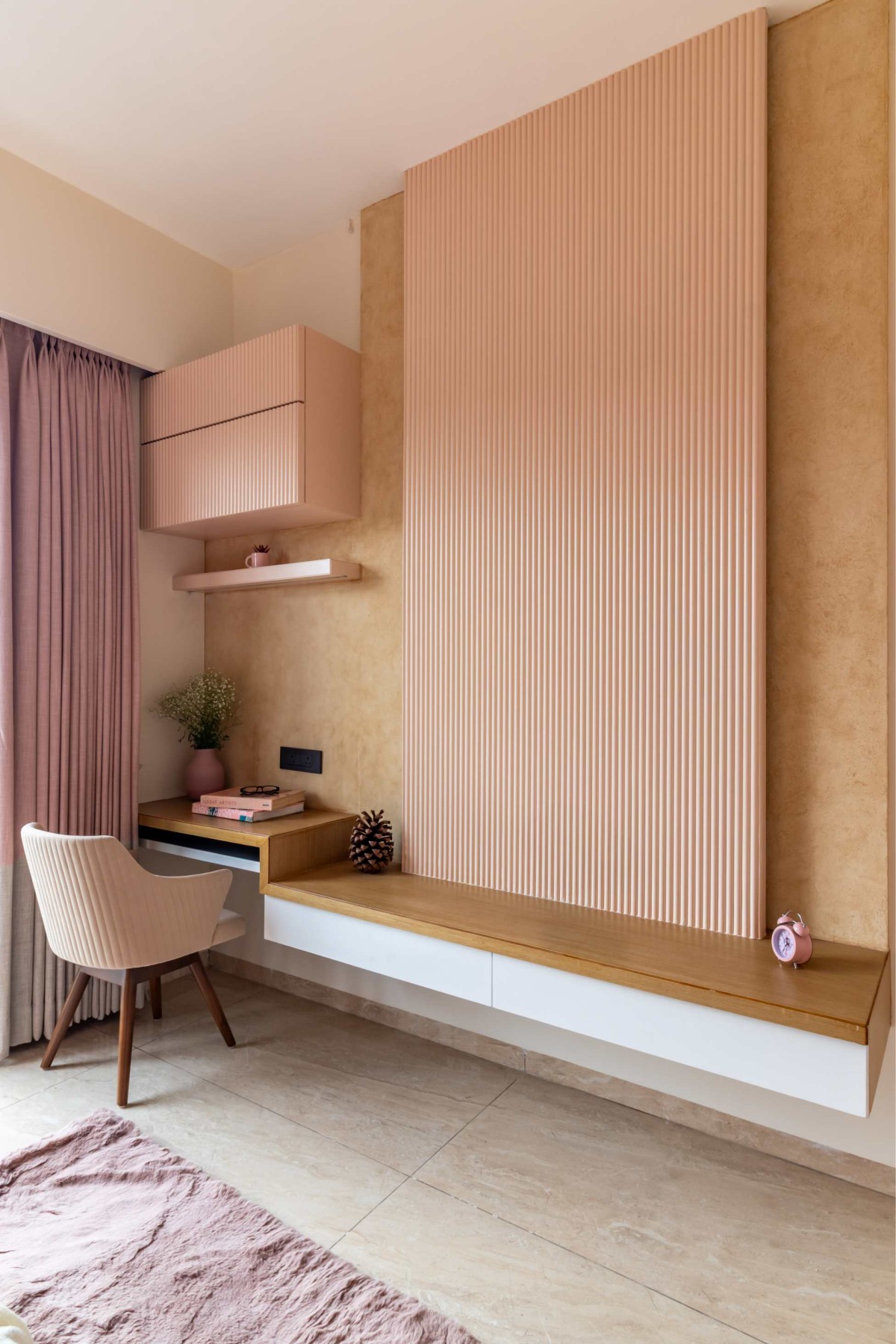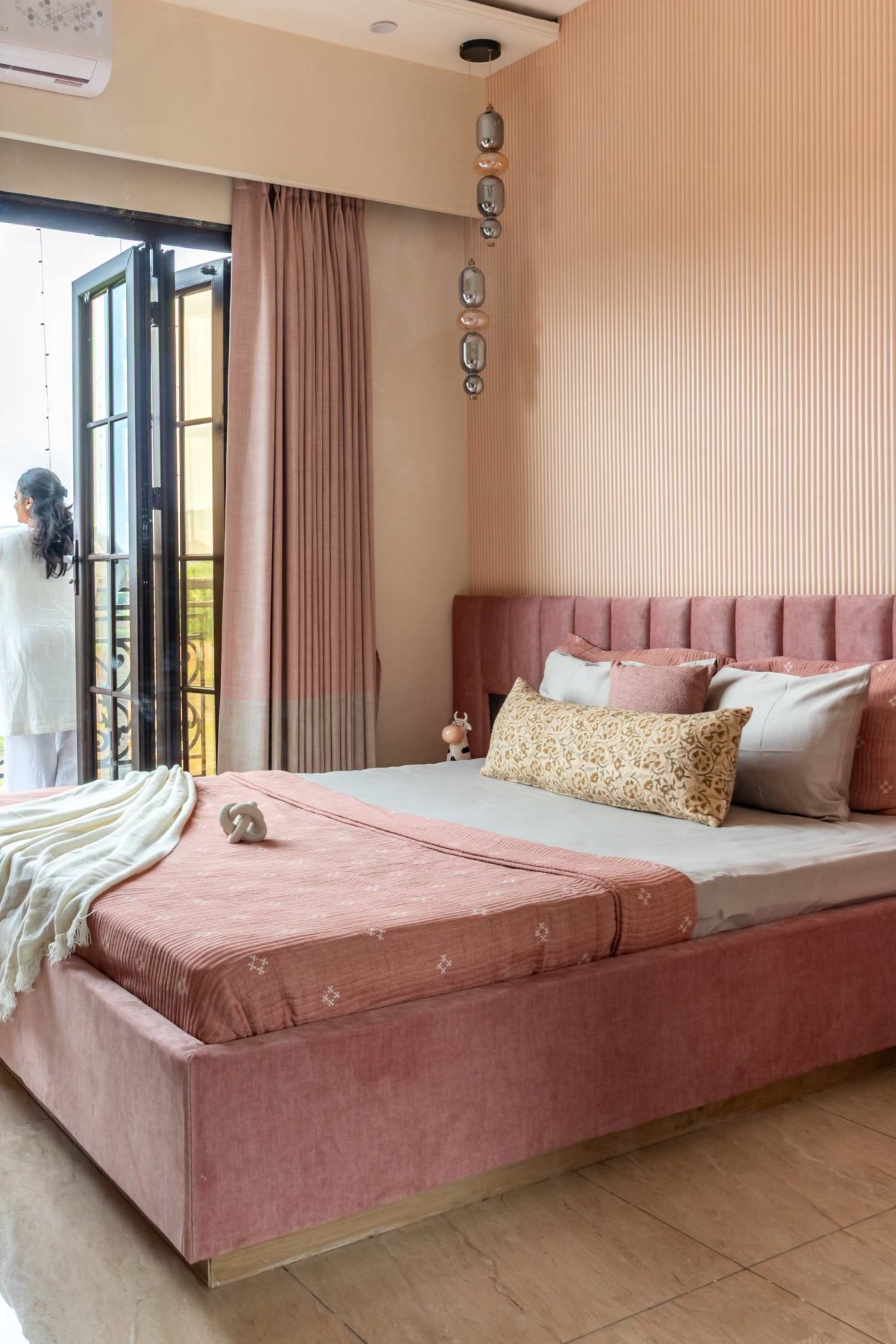 This bedroom is designed as a serene retreat that harmoniously blends elegance, warmth, and modern functionality. A blush pink palette, complemented by beige and white undertones, sets a soothing tone while maintaining a sense of luxury. The tall tufted velvet headboard, layered bedding in soft textures, and vertical pink wall paneling add depth and sophistication, while natural light from the balcony doors enhances the airy ambiance. Metallic pendant lights and a thoughtfully placed study nook further elevate the balance of comfort and practicality.