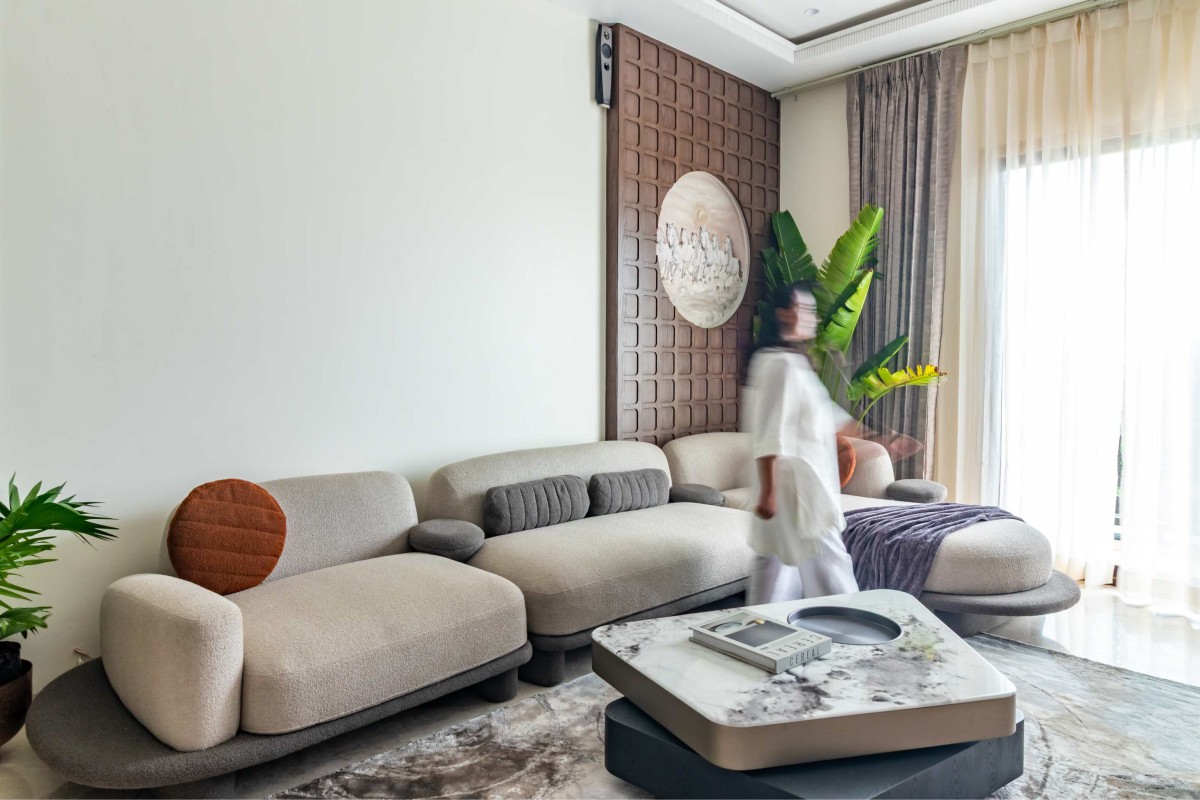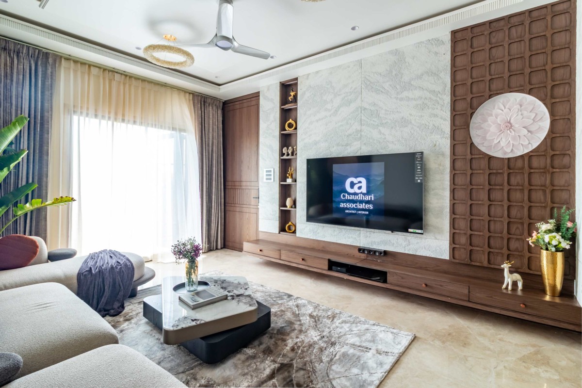 The living room of the Chandradev residence is envisioned as a refined balance of modern simplicity and understated luxury. Anchored by large beige Italian marble flooring with delicate brass inlays, the space radiates warmth and sophistication, effortlessly reflecting natural light during the day and transforming into a golden-hued haven under evening illumination. Off-white walls, accented with walnut veneer and soft grey textures, create a canvas of brightness and depth, while a vertical wood-paneled feature wall crowned with a brushed-gold framed artwork becomes the focal point of the seating area.