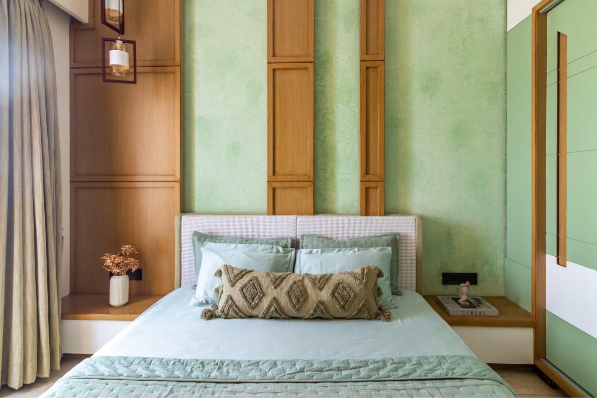 Extending beyond the bed, the study, storage, and wardrobe zones follow the same cohesive design language, blending muted greens with wood and white finishes for continuity and minimalism. A floating desk, asymmetrical cabinetry, and sleek, handle-less wardrobe emphasize clean functionality, while open shelves and curated accents invite personal expression. The restrained material palette, orchestrated lighting, and tactile finishes ensure the space transcends its role as a bedroom, becoming a complete lifestyle environment—modern yet timeless, calming yet deeply refined.