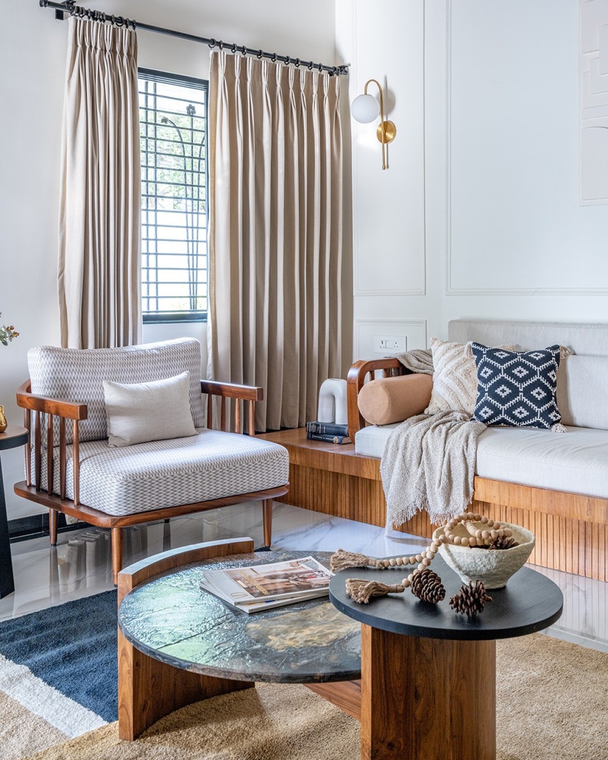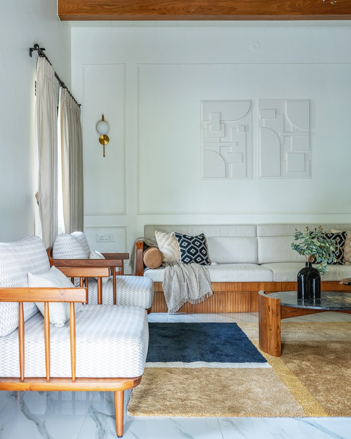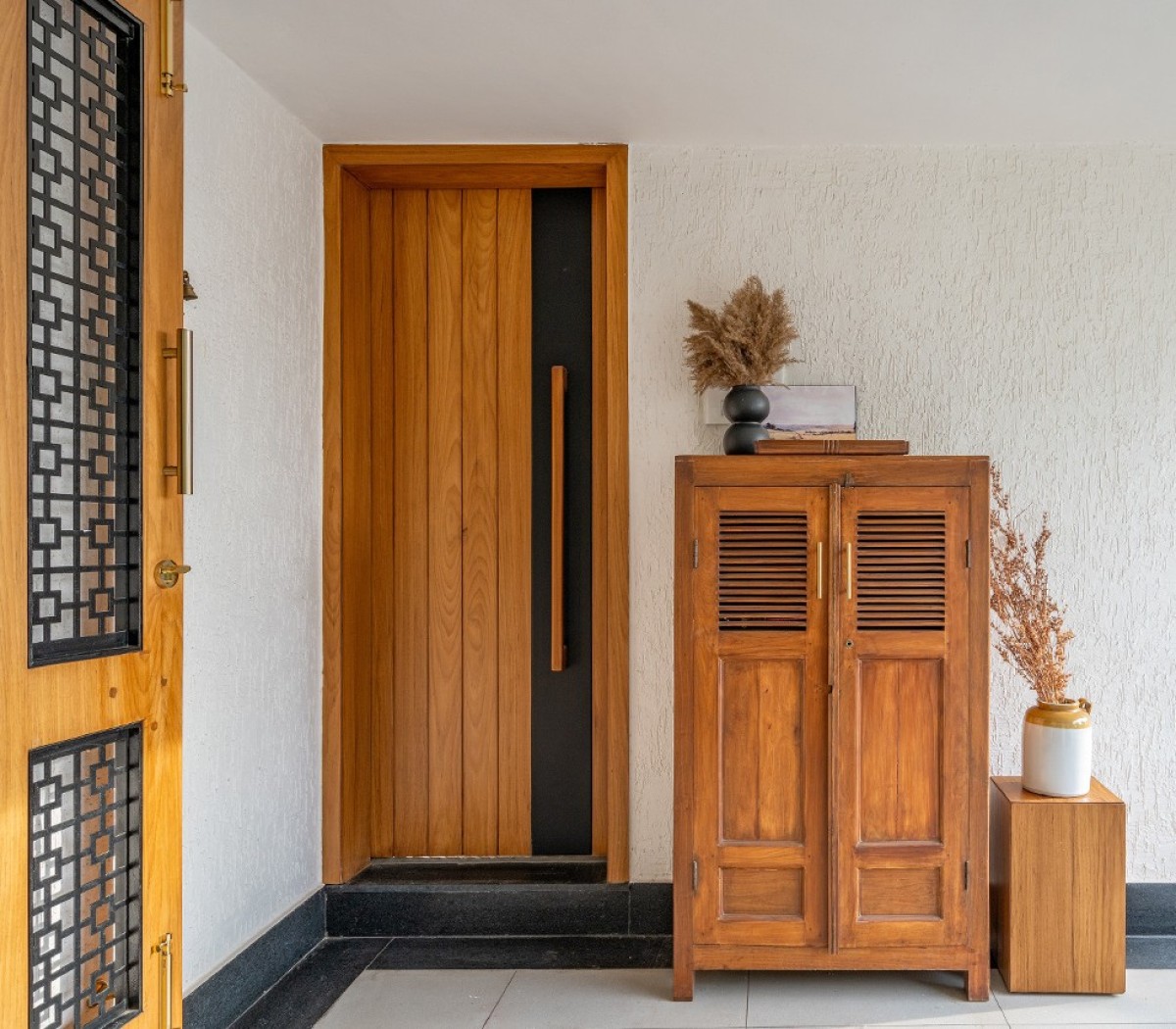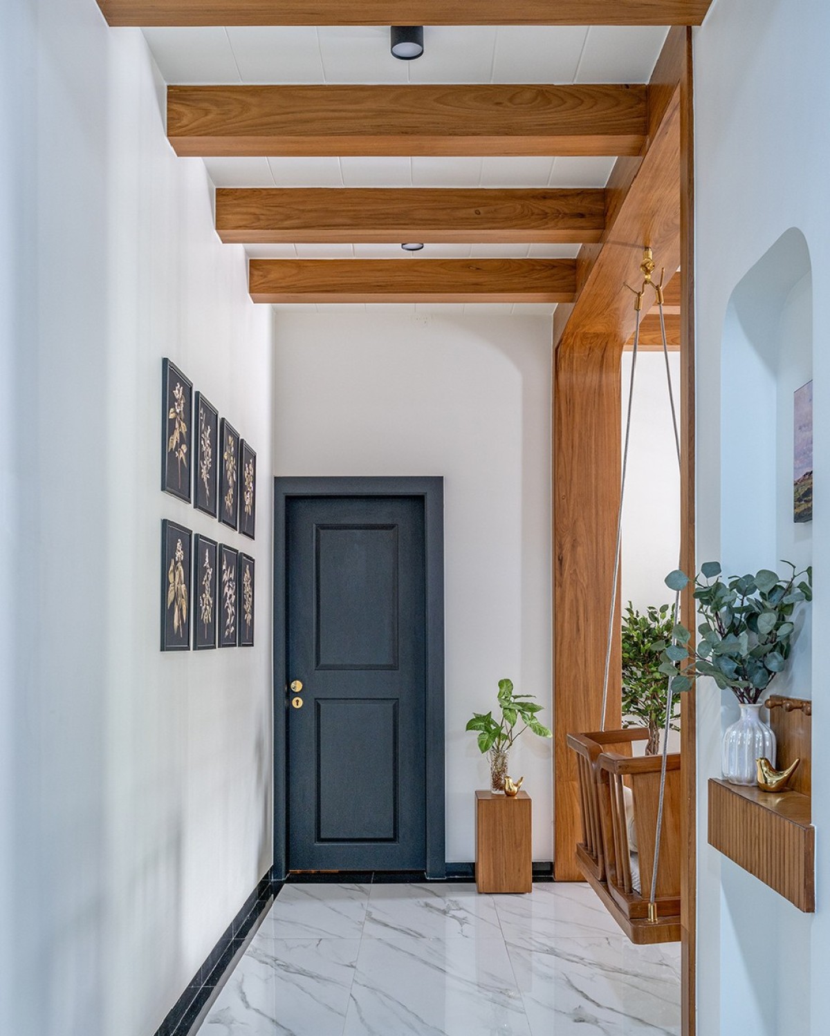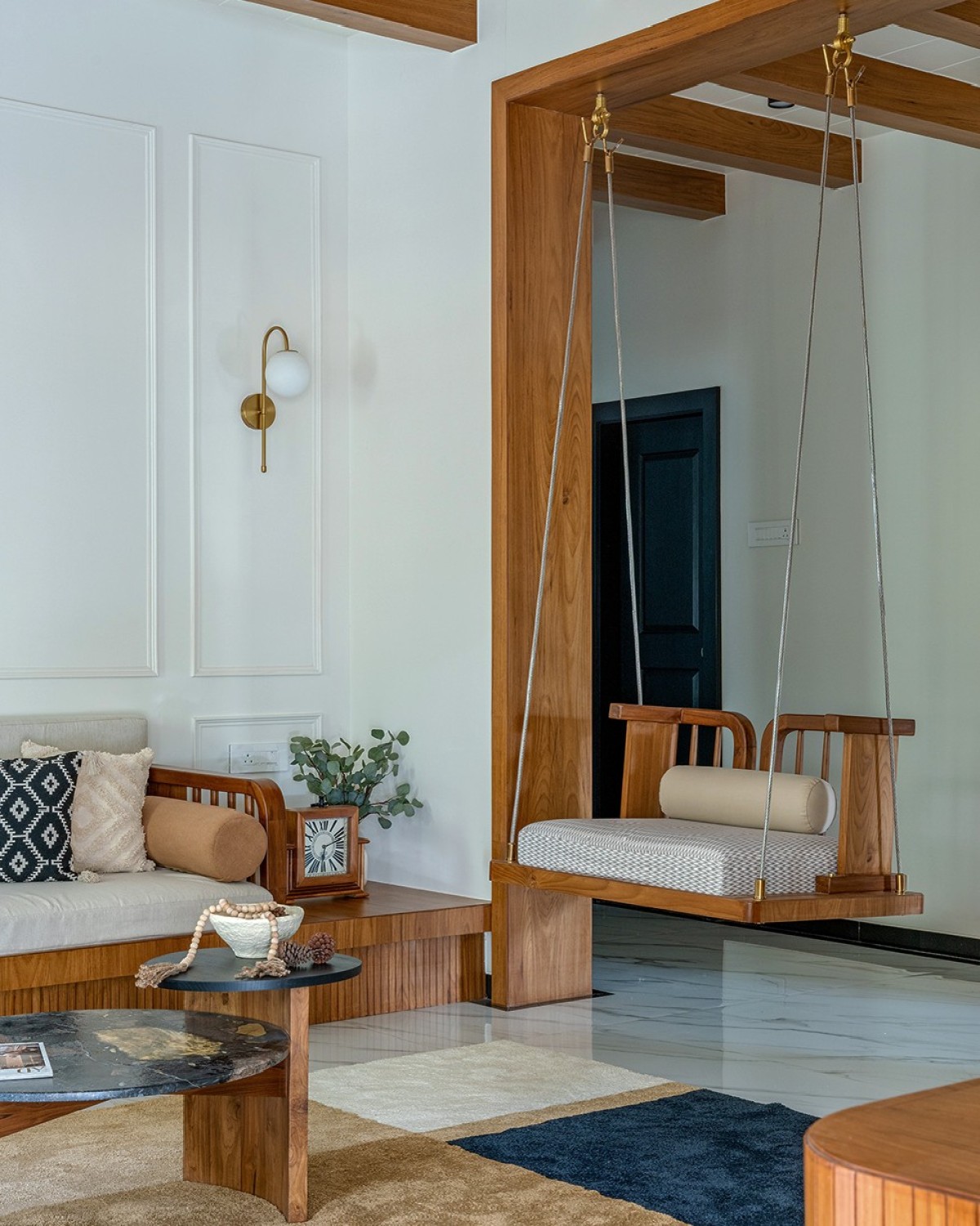 The living room, conceived as the heart of the house, showcases bespoke craftsmanship and understated luxury. Rich teak veneer furniture brings warmth and elegance, complemented by minimalistic molding panels that add subtle sophistication. A statement swing, placed within an arched portal, becomes a nostalgic focal point—bridging tradition and modernity. Cherished existing furniture pieces, including the shoe rack and dining table, were thoughtfully retained and integrated, reinforcing emotional continuity within the home.