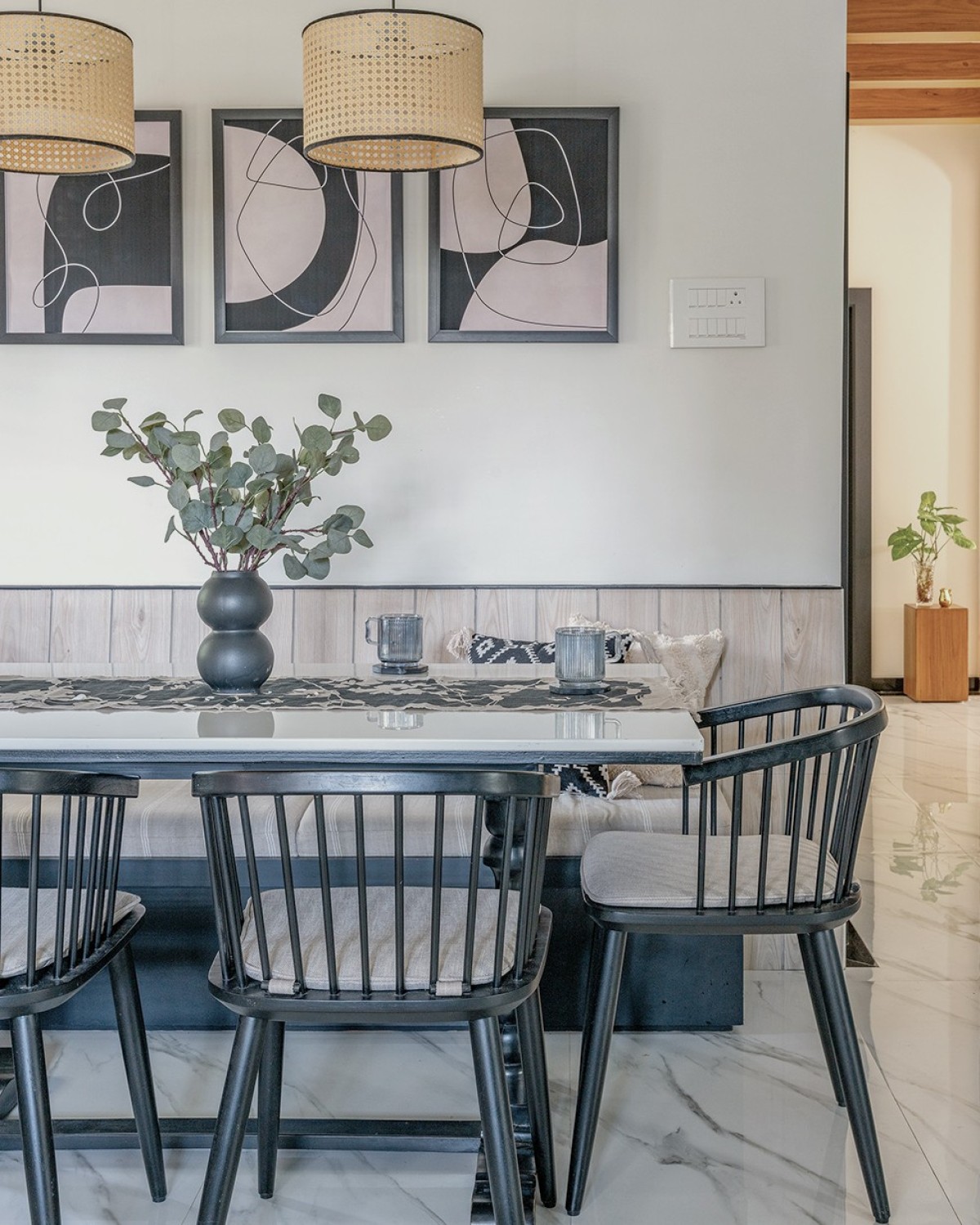 Guided by the belief that “the fondest memories are created when gathered around the table,” the dining area and kitchen were envisioned as generous, welcoming spaces where family members reconnect and guests feel at ease. The kitchen reflects a harmonious blend of modern and rustic influences, combining functionality with warmth and visual balance.