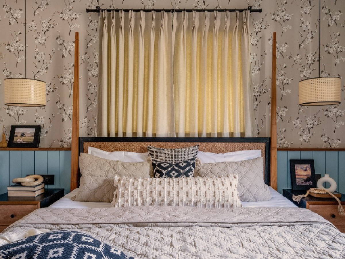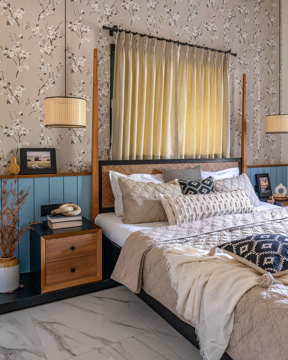 Each bedroom carries a distinct identity tailored to its occupant. The couple’s bedroom embraces tradition through a classic poster bed, while the son’s bedroom adopts a more contemporary expression with a platform bed—both spaces unified through a cohesive design language.