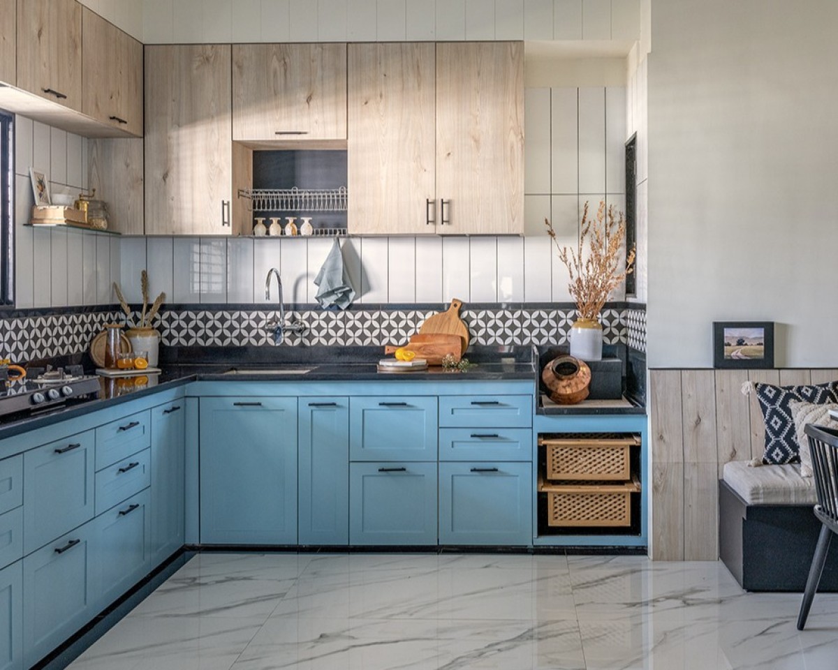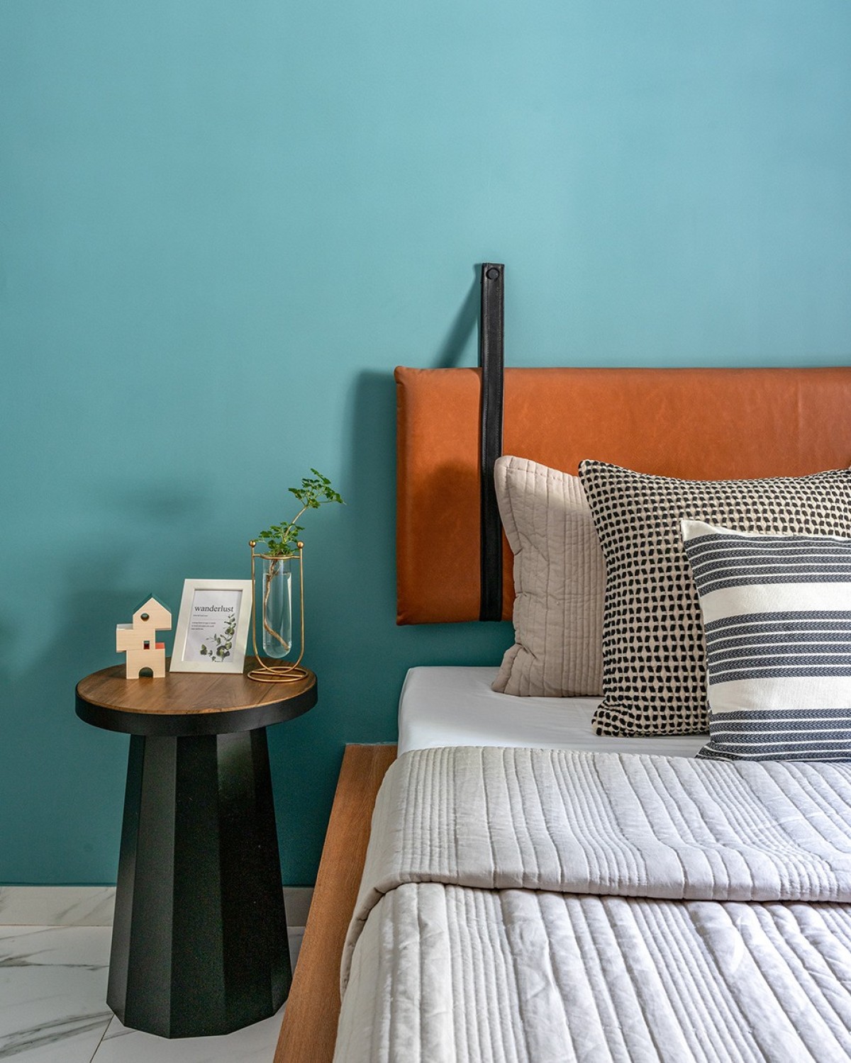 A neutral color palette dominated by teak veneer and accented with subtle pastel blue tones creates a calming oasis suited to Amravati’s hot and dry climate. This material and color strategy unifies the interiors while evoking a sense of tranquillity throughout the home.