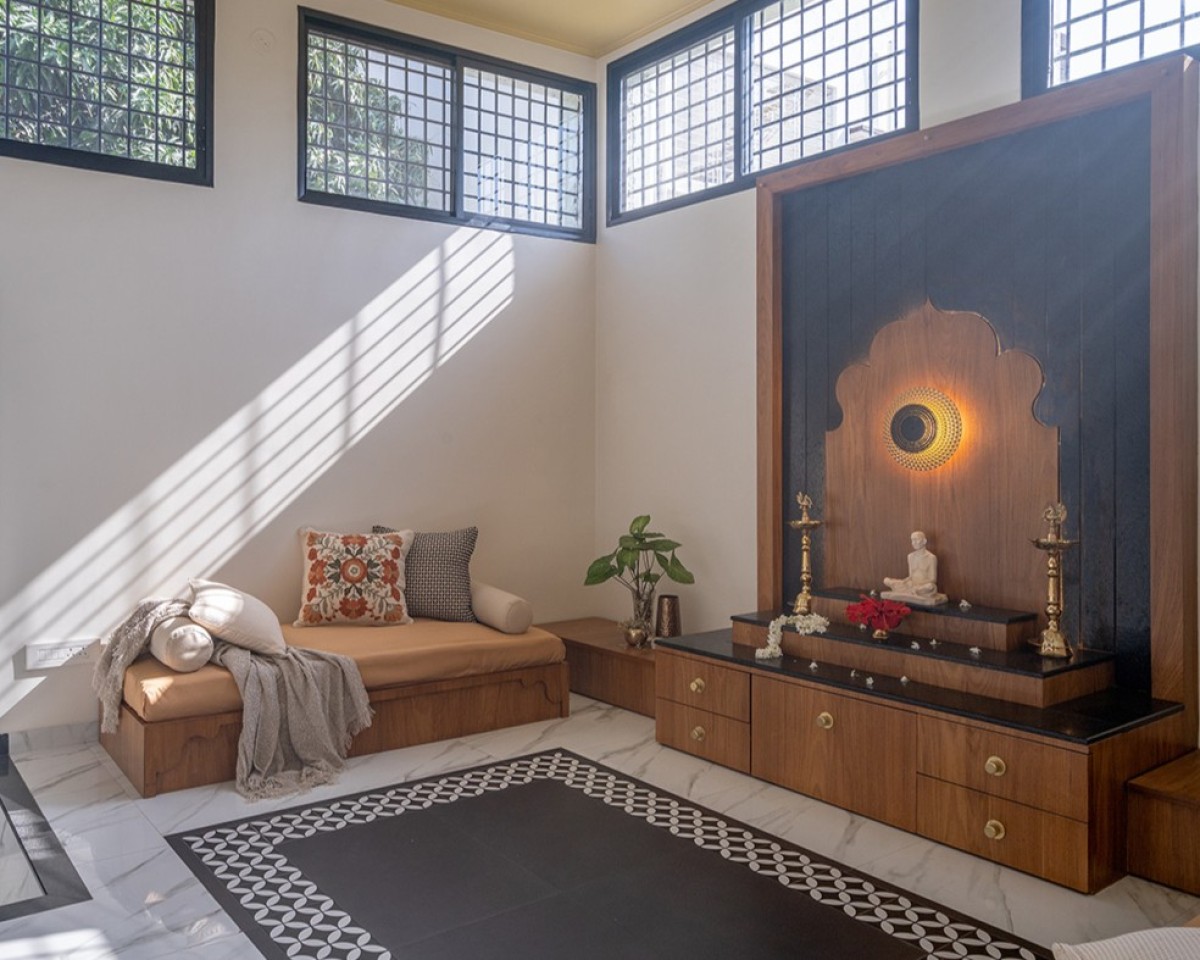 The pooja room holds immense significance in the family’s daily life. Designed as a peaceful retreat and positioned to receive ample morning sunlight, it radiates a divine aura. The warmth of natural light enhances the spiritual ambiance and subtly influences the surrounding spaces, fostering mindfulness, harmony, and positivity.