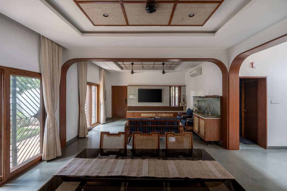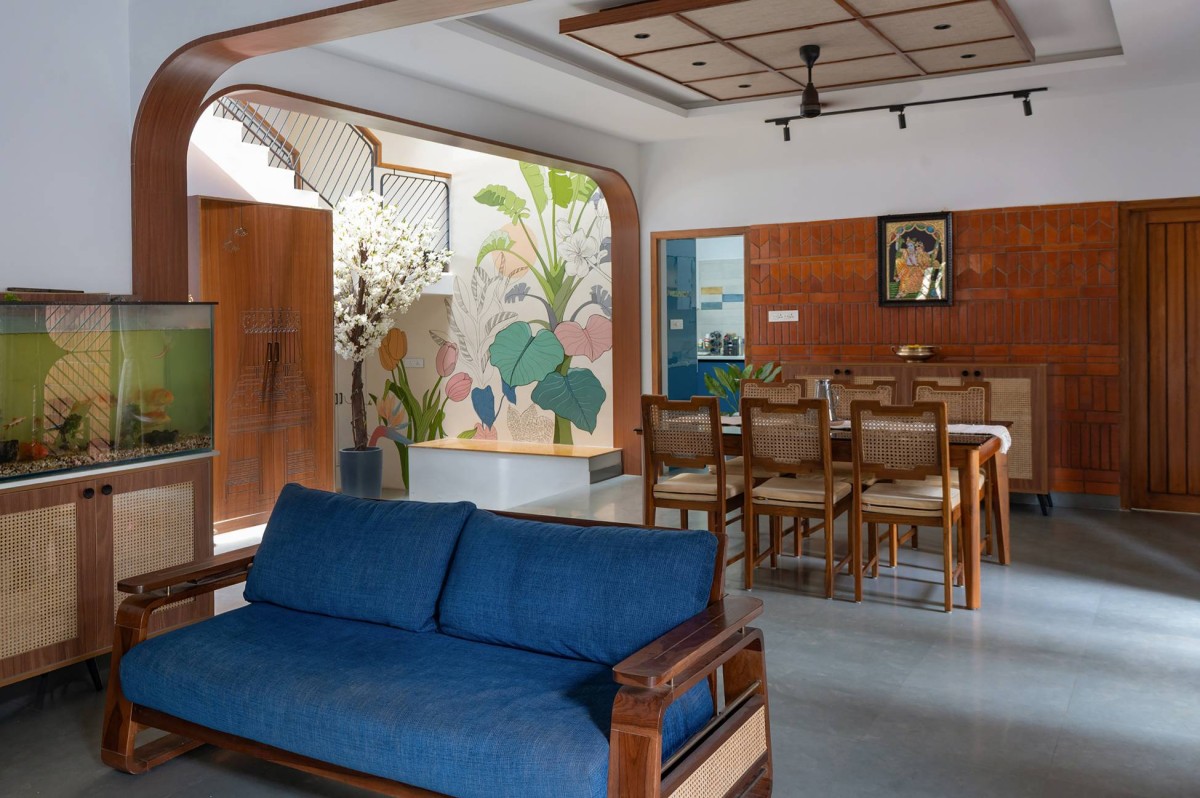 Living-cum-dining area with wooden and cane furniture of Coexistence House by D.L.E.A